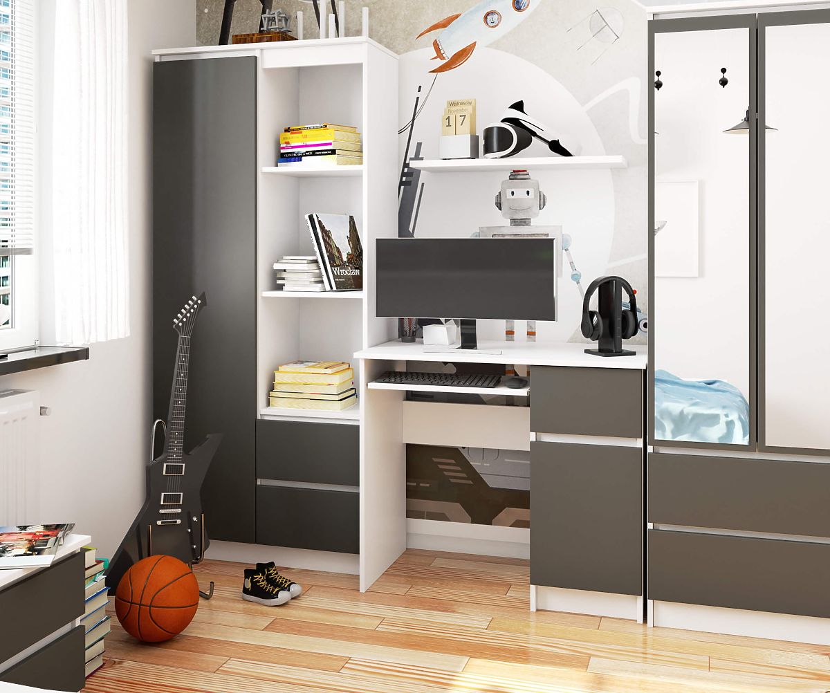Wolnostojące biurko PIKSEL 90 cm w kolorach BIAŁY/GRAFITOWY SZARY jest idealnym rozwiązaniem dla małych wnętrz. Bardzo dobrze sprawdza się jako biurko szkolne lub komputerowe. Jego ergonomiczna konstrukcja zapewnia wygodę użytkowania. Biurko wyposażone jest w wysuwaną półkę na klawiaturę, praktyczną boczną szufladę oraz szafkę z półką, gdzie swobodnie zmieszczą się segregatory i książki. Do produkcji biurka użyto przyjemnej w dotyku i łatwej w utrzymaniu matowej płyty pokrytej odporną na zarysowania warstwą laminatu. Całość uzupełniają praktyczne uchwyty w kolorze srebrnym.