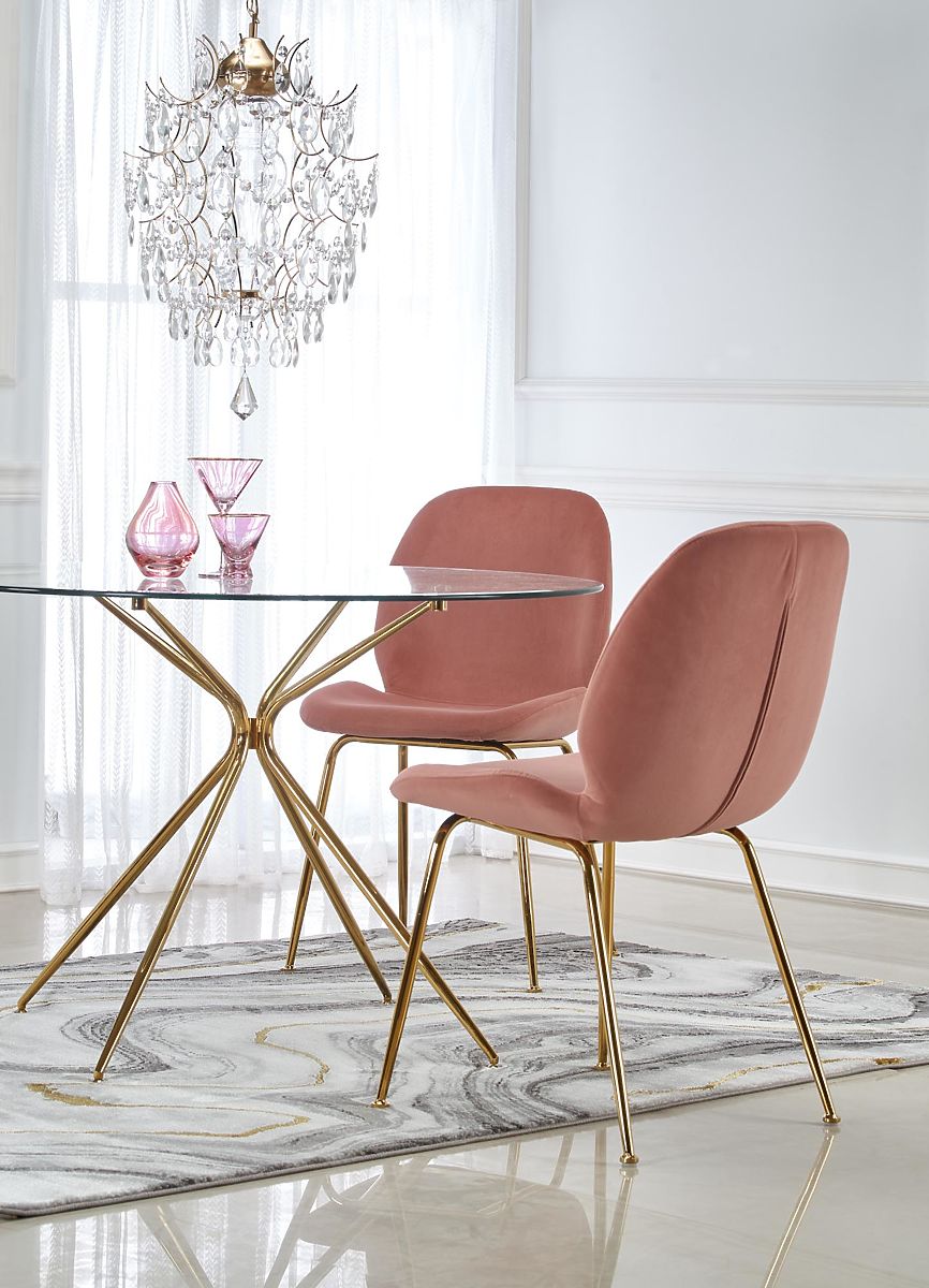 Stół jadalniany Agis to stylowy dodatek do nowoczesnych jadalni, gdzie wyróżnia się swoją lekką estetyką i pomysłową konstrukcją. Dzięki okrągłemu szklanemu blatowi wygląda lekko, nie obciąża optycznie przestrzeni i jest idealnym wyborem także do mniejszych wnętrz. Blat z hartowanego przezroczystego szkła jest nie tylko elegancki, ale także bardzo praktyczny – łatwy w utrzymaniu i odporny na codzienne użytkowanie. Wystarczy go przetrzeć i wypolerować, aby zachował swój perfekcyjny wygląd. Dominantą stołu jest metalowa podstawa w złotym wykończeniu, która przyciąga uwagę oryginalnym kształtem i nadaje całości luksusowy charakter. Jednocześnie zapewnia wysoką stabilność i wytrzymałość konstrukcji. Stół wygodnie pomieści do 4 osób, co czyni go idealnym rozwiązaniem do codziennego użytku oraz okazjonalnych spotkań.
