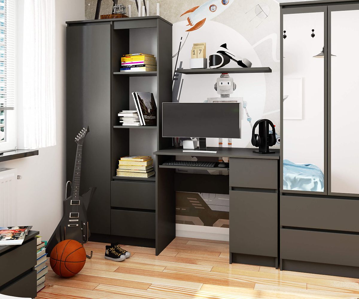 Wolnostojące biurko PIKSEL 90 cm w kolorze GRAFIT SZARY jest idealnym rozwiązaniem dla małych wnętrz. Bardzo dobrze sprawdzi się jako biurko szkolne lub komputerowe. Jego ergonomiczna konstrukcja zapewnia komfort użytkowania. Biurko wyposażone jest w wysuwaną półkę na klawiaturę, praktyczną boczną szufladę oraz szafkę z półką, do której łatwo mieszczą się segregatory i książki. Do produkcji biurka użyto przyjemnej w dotyku i łatwej w utrzymaniu matowej płyty pokrytej odporną laminowaną warstwą. Całość uzupełniają praktyczne uchwyty w kolorze srebrnym.