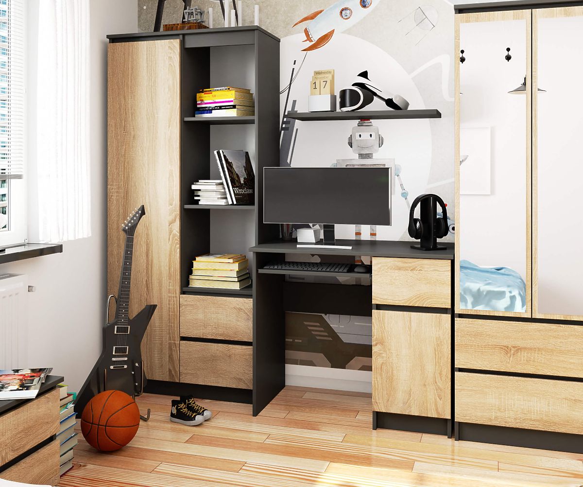 Wolnostojące biurko PIKSEL 90 cm w kolorach GRAFIT SZARY/DĄB SONOMA jest idealnym rozwiązaniem dla małych wnętrz. Doskonale sprawdzi się jako biurko szkolne lub komputerowe. Jego ergonomiczna konstrukcja zapewnia komfort użytkowania. Biurko wyposażone jest w wysuwaną półkę na klawiaturę, praktyczną boczną szufladę oraz szafkę z półką, w której mogą swobodnie stać segregatory i książki. Do produkcji biurka użyto przyjemnej w dotyku i łatwej w utrzymaniu matowej płyty pokrytej odporną warstwą laminatu. Całość uzupełniają praktyczne uchwyty w kolorze srebrnym.
