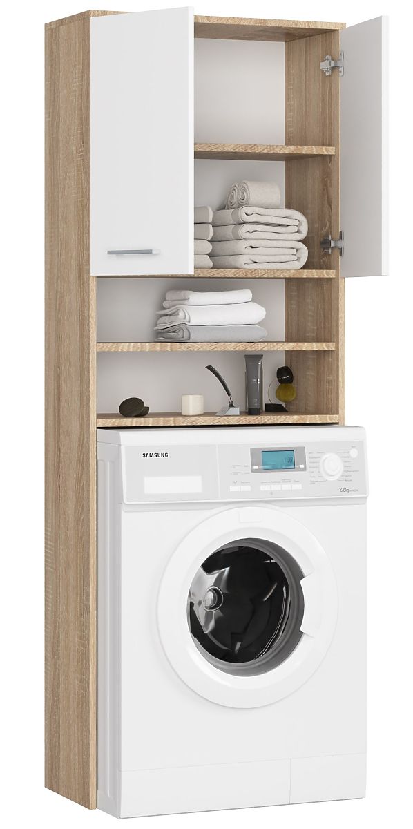Szafka łazienkowa nad pralkę to praktyczny i atrakcyjnie zaprojektowany mebel. Regał posiada w dolnej części, bezpośrednio nad wnęką na pralkę, dwie przestronne półki, a w górnej części przestrzeń do przechowywania zamykaną podwójnymi drzwiami. Szafka ma uniwersalne zastosowanie i ułatwia doskonałe wykorzystanie przestrzeni w łazience oraz utrzymanie w niej idealnego porządku. Mebel można używać na ręczniki, środki czystości lub proszki do prania i płyny do płukania. Słupek łazienkowy nad pralkę wykonany jest z laminowanej płyty odpornej na wilgoć i ścieranie. Do starannego wykończenia krawędzi mebla producent użył trwałego obrzeża ABS. Drzwi mebla wyposażone są w wygodne i estetyczne metalowe uchwyty. Regał łazienkowy, w którym zastosowano połączenie dwóch kolorów – klasycznej bieli i dębu sonoma, łatwo dopasowuje się do każdego typu wnętrza łazienkowego. Szafka łazienkowa wygląda lekko, dzięki czemu prezentuje się efektownie nawet w łazienkach o niestandardowo małej powierzchni.