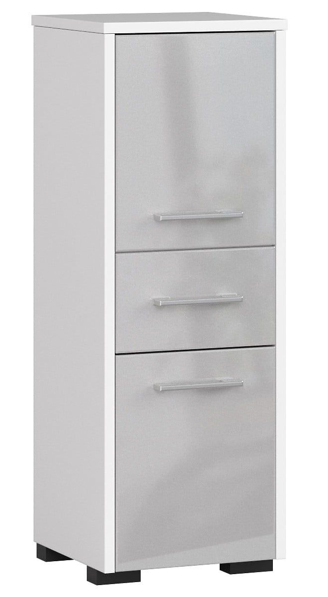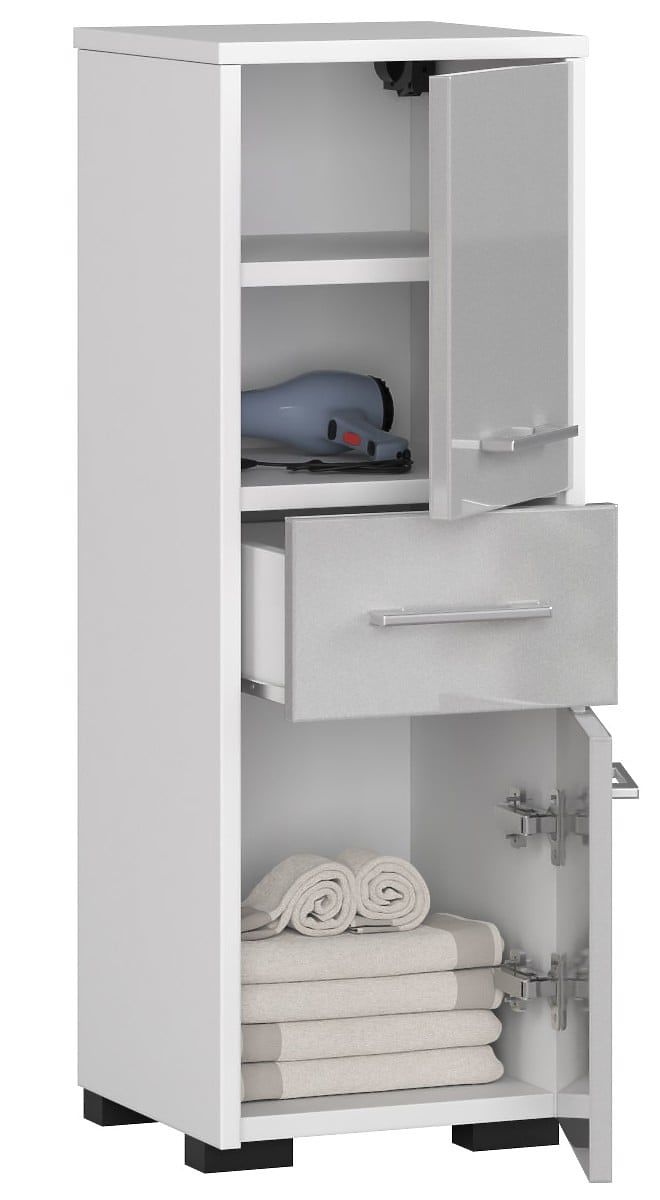 Słupek łazienkowy FIN z szufladą i dwoma uchylnymi drzwiami wykonany jest z wysokiej jakości, odpornej na ścieranie laminowanej płyty meblowej Kronospan. Biały korpus mebla doskonale komponuje się z frontami o akrylowej powierzchni w wysokim połysku w metalicznym kolorze. Pod blatem słupka znajduje się szafka z dwoma półkami i drzwiami. Niżej znajduje się szuflada, a pod nią kolejna szafka – tym razem z jedną półką. Elegancką szafkę łazienkową uzupełniają interesujące, wygodne i proste uchwyty.