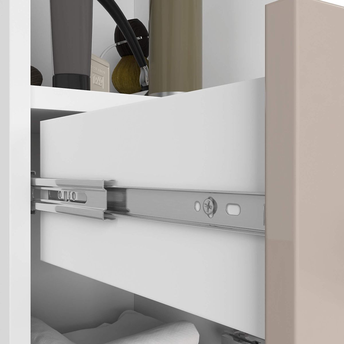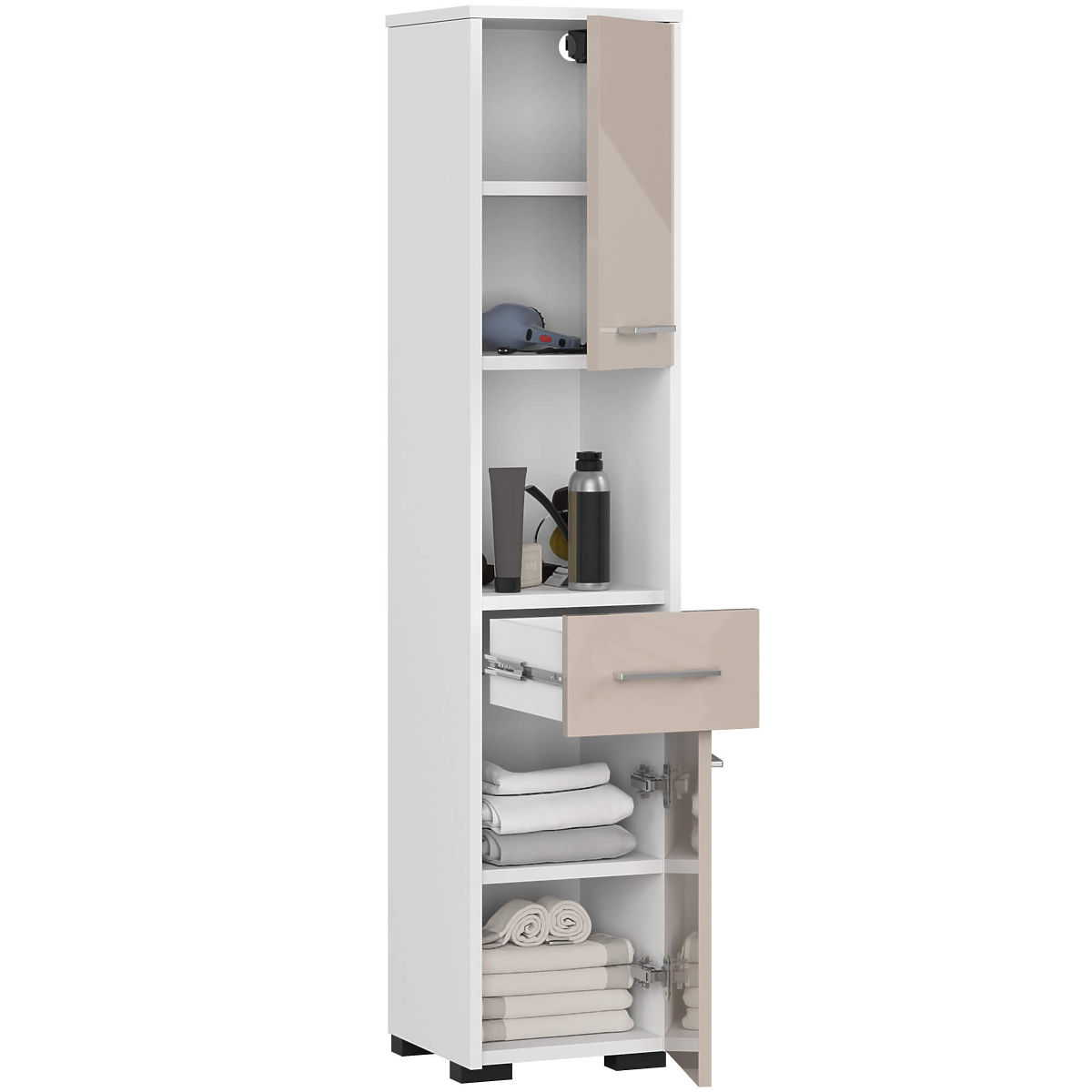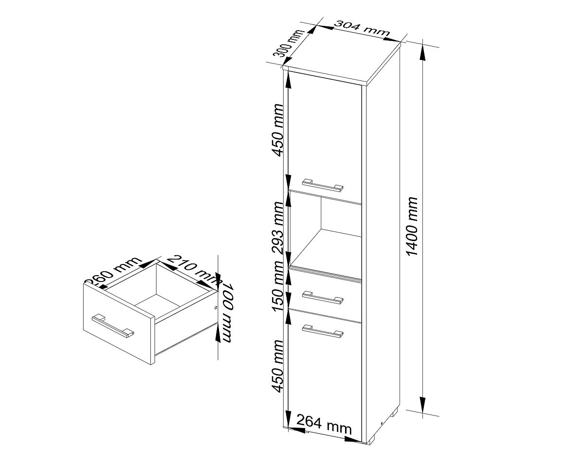 Regały to bardzo funkcjonalne meble, które znajdą zastosowanie w różnych pomieszczeniach. Mogą być z powodzeniem umieszczone w łazience. Słupek łazienkowy regał FIN 2D 1SZ 1W składa się z elementów z wysokiej jakości laminowanej płyty firmy kronospan 16 mm, a na ich krawędziach znajduje się obrzeże ABS. Dzięki temu szafka jest wysoce odporna na wilgoć, ścieranie i uszkodzenia mechaniczne. W dolnej i górnej części regału znajduje się szafka zamykana drzwiczkami, podzielona półką. Można w nich przechowywać ręczniki, pościel lub środki chemiczne. Środkową część słupka zajmuje wysuwana szuflada. To idealne miejsce na kosmetyczne drobiazgi. Nad szufladą znajduje się przestronna otwarta przestrzeń, którą można wykorzystać do przechowywania kosmetyków większych rozmiarów. Drzwiczki regału zdobią srebrne uchwyty.