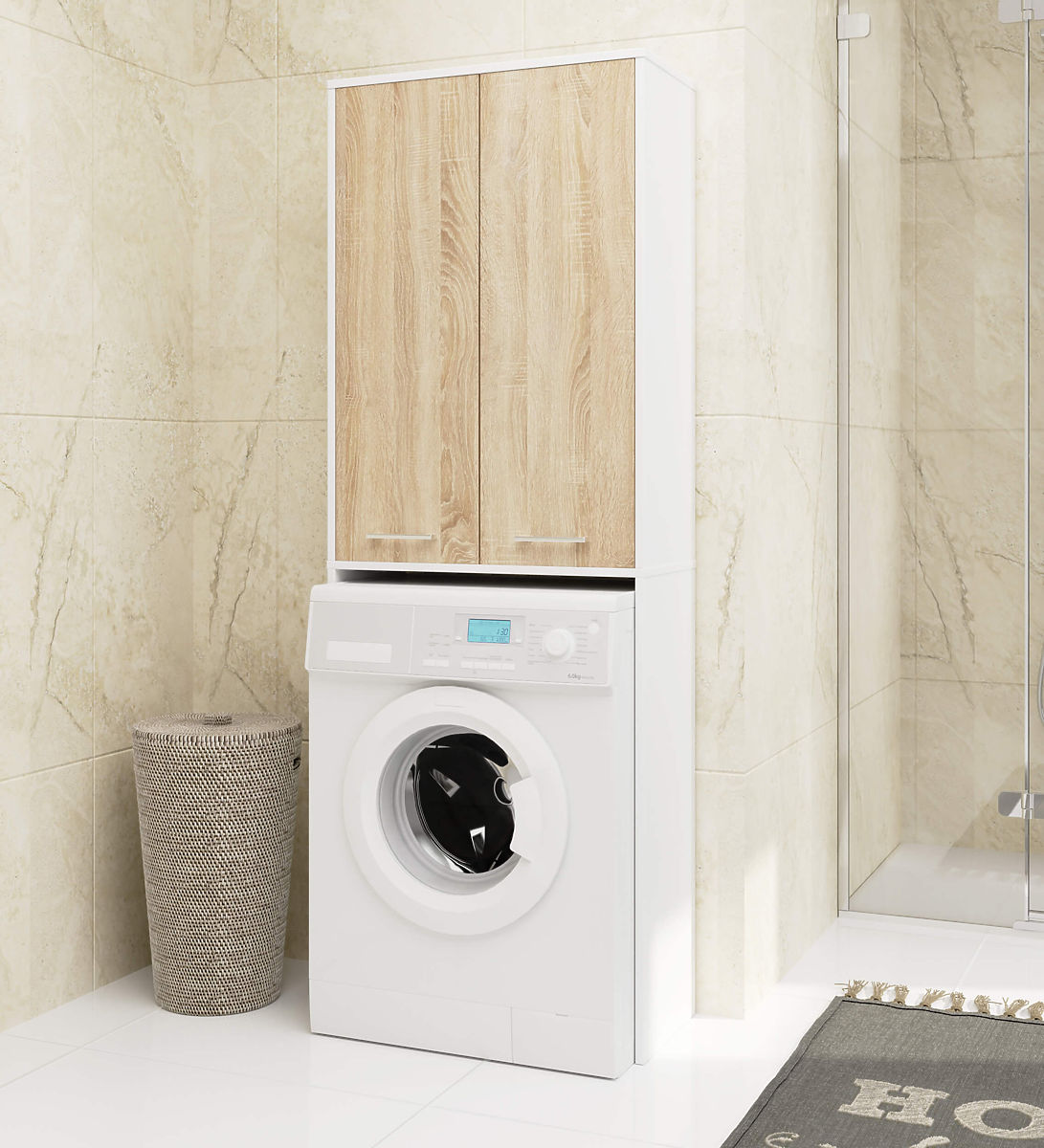 Jeśli chcemy, aby nasza łazienka była urządzona wygodnie i stylowo, powinniśmy skupić się na solidnie i funkcjonalnie wykonanych meblach. Takim z pewnością jest szafka nad pralkę. To idealny sposób na wykorzystanie przestrzeni nad pralką, która zazwyczaj pozostaje niewykorzystana. Optymalne wymiary tego słupka czynią go świetnym rozwiązaniem dla łazienek o małej powierzchni. Ergonomiczny kształt pozwala na jego zastosowanie w każdym pomieszczeniu. Ten mebel, składający się z nadstawki nad pralkę i szafki nad nią, tworzy dużą ilość przestrzeni do przechowywania różnych przedmiotów. W szafce można przechowywać produkty takie jak detergenty czy środki higieniczne. Te półki są przeznaczone do przechowywania kosmetyków osobistych lub ręczników. Piękny odcień biały z frontami dąb sonoma gwarantuje nam elegancki wygląd łazienki. Laminowana płyta, z której wykonana jest ta szafka, to wysokiej jakości materiał. Zapewnia trwałość i solidność mebli oraz zachowanie ich estetycznego wyglądu.
