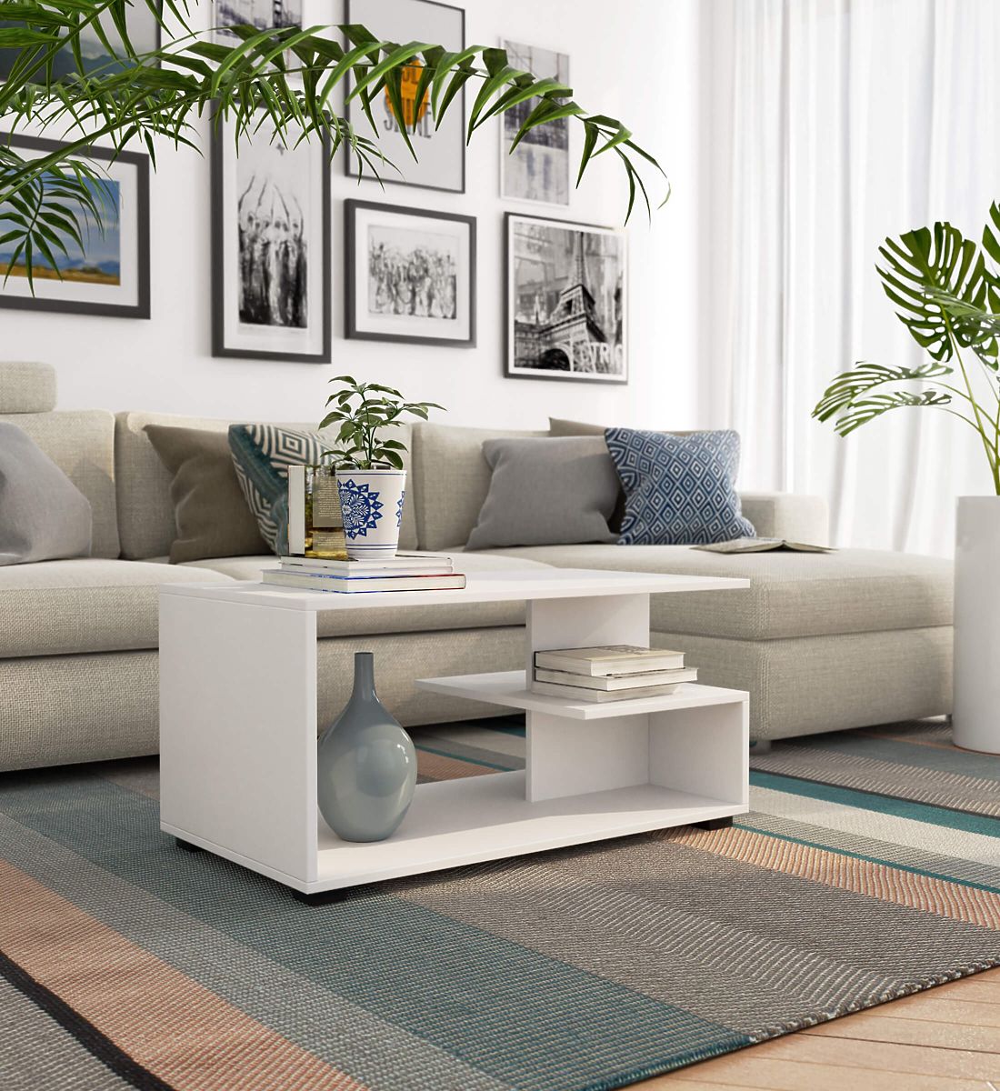 Biały stolik kawowy Pin o wymiarach 90x45x51 cm, wykonany z laminowanej płyty. .. więcej