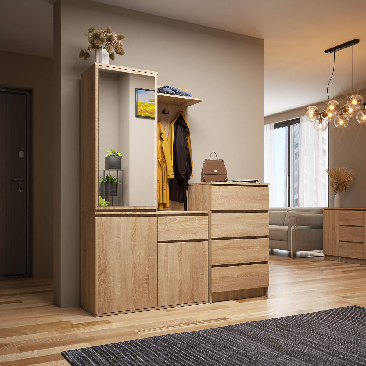 W przestrzeniach z ograniczoną ilością miejsca niezbędne są rozwiązania maksymalizujące funkcjonalność wnętrza. Szafa do przedpokoju ENTRO to doskonały wybór dla wąskiego korytarza lub przedpokoju. Pozwala sprytnie wykorzystać małą przestrzeń, jednocześnie nadając pomieszczeniu nowoczesny styl. Produkt oferuje wiele praktycznych rozwiązań, w tym wystarczająco dużo miejsca na powieszenie kurtek czy płaszczy, półkę na buty i akcesoria oraz szufladę na drobiazgi. Wyjątkowo funkcjonalne rozmieszczenie i duży wybór kolorystyczny spełnią oczekiwania nawet najbardziej wymagających użytkowników.