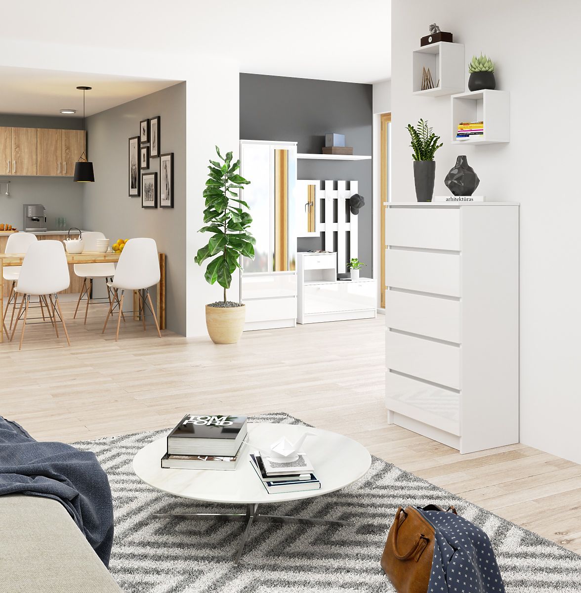 Przestronna komoda wyposażona w cztery szuflady to mebel, który znajdzie zastosowanie w wielu pomieszczeniach mieszkalnych i biurowych. Umożliwia organizację przestrzeni do przechowywania niezbędnych przedmiotów w sypialni, salonie, pokoju dziecięcym czy studenckim. Doskonale nadaje się również do domowego biura lub przedpokoju. Łączy prosty i elegancki wygląd, ponadczasową kolorystykę i solidną konstrukcję. KOMODA K 60 cm w białym kolorze jest wyposażona w akrylowe fronty z wysokim połyskiem.