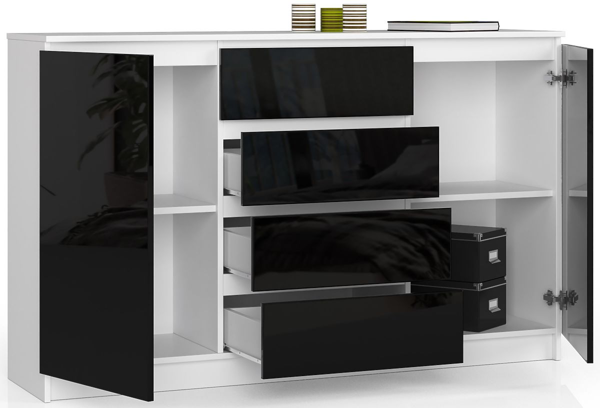 Korpus komody wykonany z płyty laminowanej 16mm biały półmat, Fronty wykonane z płyty AKRYL dekor Czarny 19mm wysoki połysk.