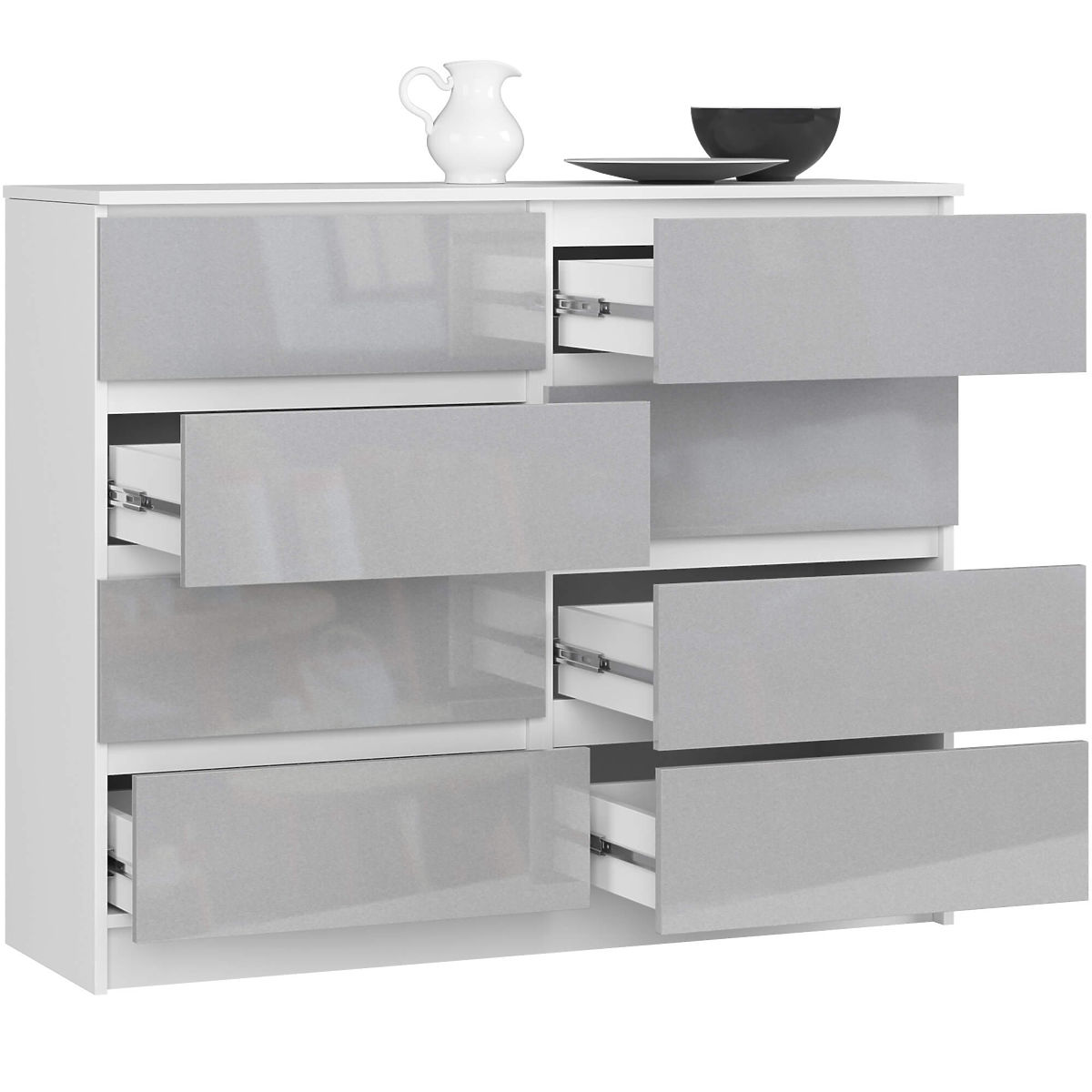 Oferujemy dużą komodę z 8 szufladami. Komoda ma biały półmatowy korpus wykonany z płyty laminowanej o grubości 16 mm, która jest bardzo odporna na zarysowania. Fronty wykonane są z płyty MDF z powłoką akrylową o grubości 19 mm, która charakteryzuje się wysoką trwałością i jest odporna na blaknięcie pod wpływem intensywnego światła słonecznego. Krawędzie są zabezpieczone obrzeżem ABS, które zapewnia wysoką ochronę przed uszkodzeniami mechanicznymi i zarysowaniami. Szuflady bez uchwytów mają nowoczesny kolor metalik z wysokim połyskiem. Szuflady poruszają się na metalowych prowadnicach kulkowych. Komoda ma prosty i jednocześnie bardzo uniwersalny wygląd. Doskonale pasuje do każdego wnętrza, będzie wyglądać równie dobrze w salonie, sypialni czy nawet w biurze. Dzięki bardzo pojemnym i przestronnym szufladom w każdym pomieszczeniu zapanuje porządek. Do tego modelu komody można z powodzeniem dopasować inne meble z serii CLP.
