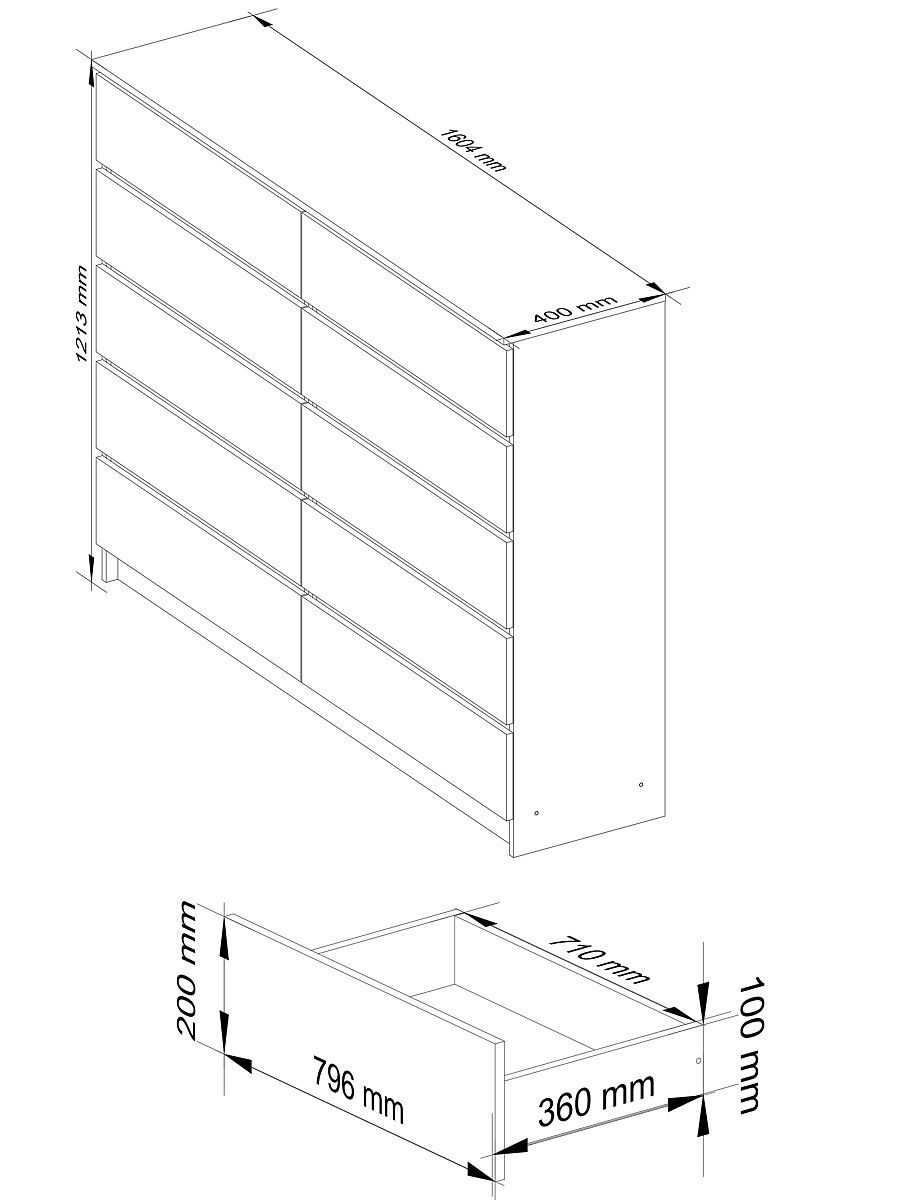 Komoda składa się z 10 szuflad, co zapewnia wiele wolnej przestrzeni do wykorzystania. Wszystkie szuflady poruszają się płynnie i cicho dzięki metalowym prowadnicom rolkowym. Mebel jest więc bardzo funkcjonalny. Jednocześnie wygląda doskonale. Jest prosty w formie, dzięki czemu można go dostosować do różnych typów pomieszczeń i ich aranżacji.