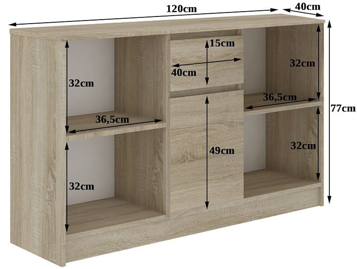 Wymiary mebla to 120 cm x 77 cm x 40 cm. Wszystkie osoby, które szukają atrakcyjnej, jakościowej, ale także cenowo korzystnej opcji do urządzanego pomieszczenia, zapraszamy do bliższego zapoznania się z tą interesującą ofertą. Mamy nadzieję, że spełni oczekiwania nawet najbardziej wymagających osób. Komoda składa się z dwóch otwartych półek, jednej za drzwiami i jednej szuflady. Całość pięknie prezentuje się samodzielnie oraz w połączeniu z innymi meblami z tej serii. Zapraszamy do zakupu.