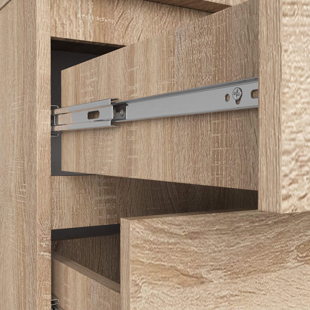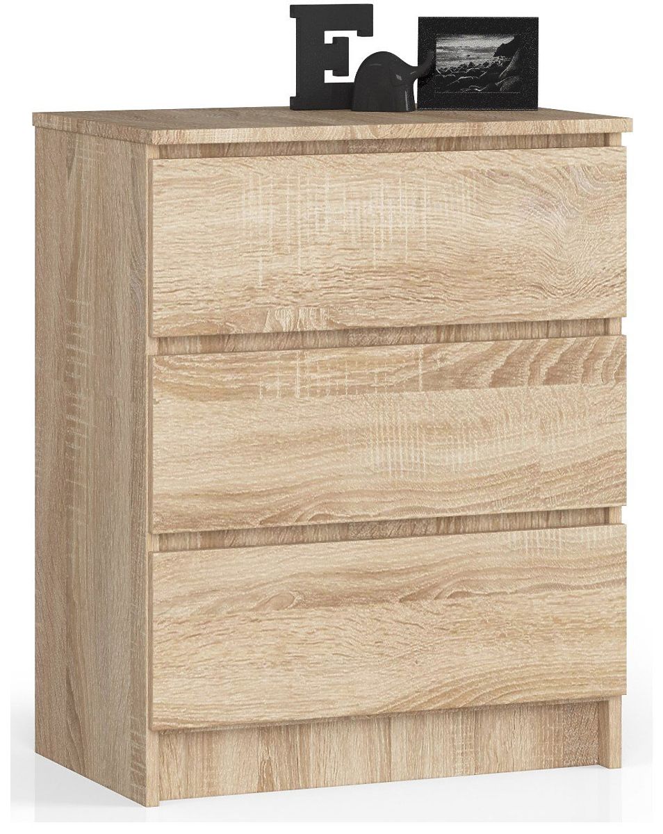 Mała, ale pojemna komoda z trzema szufladami, której wykończenie spełni oczekiwania wymagających klientów. Zastosowano dąb sonoma, kolor, który doskonale pasuje do jasnych wnętrz. Produkt nadaje się do sypialni, salonu, pokoju lub przedpokoju - wszystko zależy od potrzeb naszych klientów. Oferujemy mebel wykonany z laminowanej płyty o grubości aż 16 milimetrów. Jest to materiał odporny na ścieranie, dodatkowo wzmocniony obrzeżem ABS. Model wykorzystuje szuflady poruszające się na metalowych prowadnicach kulkowych, co zapewnia płynny, delikatny i precyzyjny ruch.