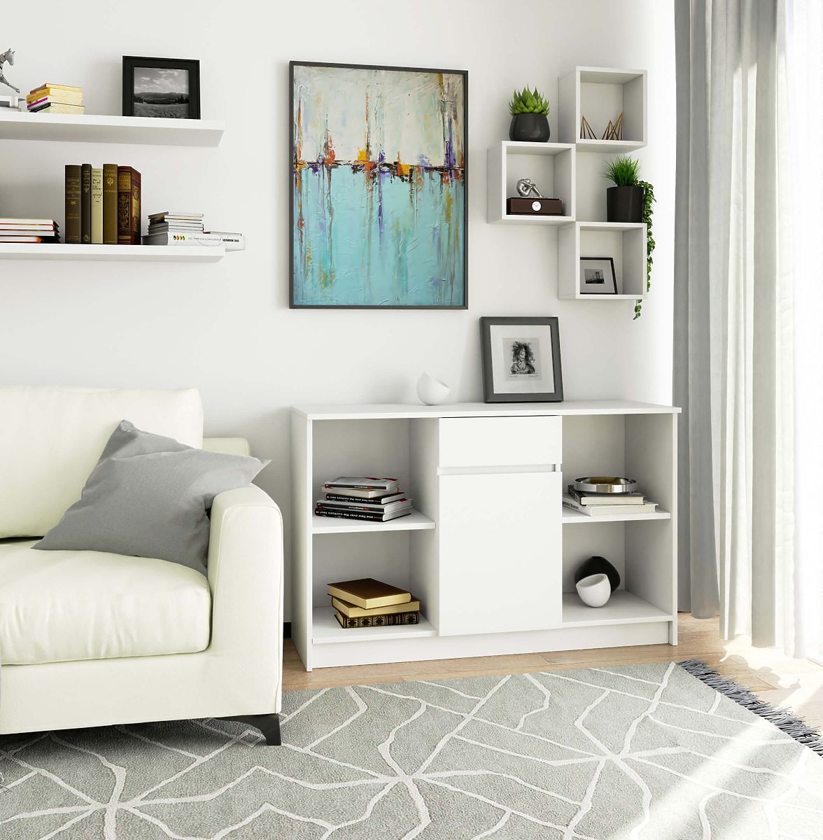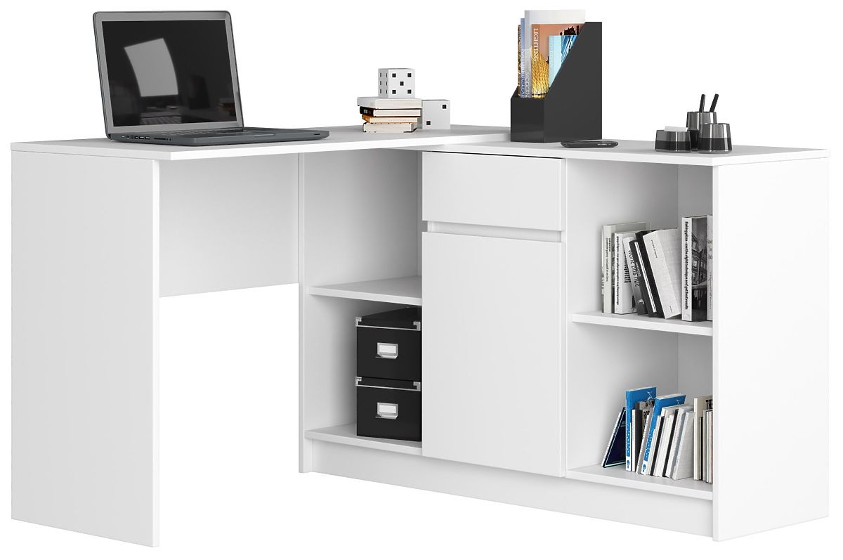 Biała komoda pochodząca z zestawu B-17 może służyć jako samodzielny, niezależny element wyposażenia każdego pomieszczenia. Dzięki modułowej konstrukcji można ją połączyć z innym segmentem zestawu i stworzyć wygodny stół narożny (dodatkowe elementy w formie stołu do nabycia w naszym sklepie). Środkowa część komody zawiera jedną szufladę i zamykane drzwi, które umożliwiają swobodne przechowywanie. Dodatkowo posiada cztery oddzielne, symetryczne półki z dużą ilością miejsca na ekspozycję. Komoda o długości 120 cm, wysokości 77 cm jest wykonana z płyty laminowanej. Komoda została zaprojektowana tak, aby pasowała do większości pomieszczeń. Może być interesującym elementem wnętrza salonu, pełnić rolę funkcjonalnego mebla do przechowywania rzeczy w sypialni, nadaje się również jako dodatkowy segment kuchni. Dzięki neutralnej białej barwie i minimalistycznemu designowi stanie się atrakcyjnym i przede wszystkim funkcjonalnym dodatkiem każdego wnętrza.