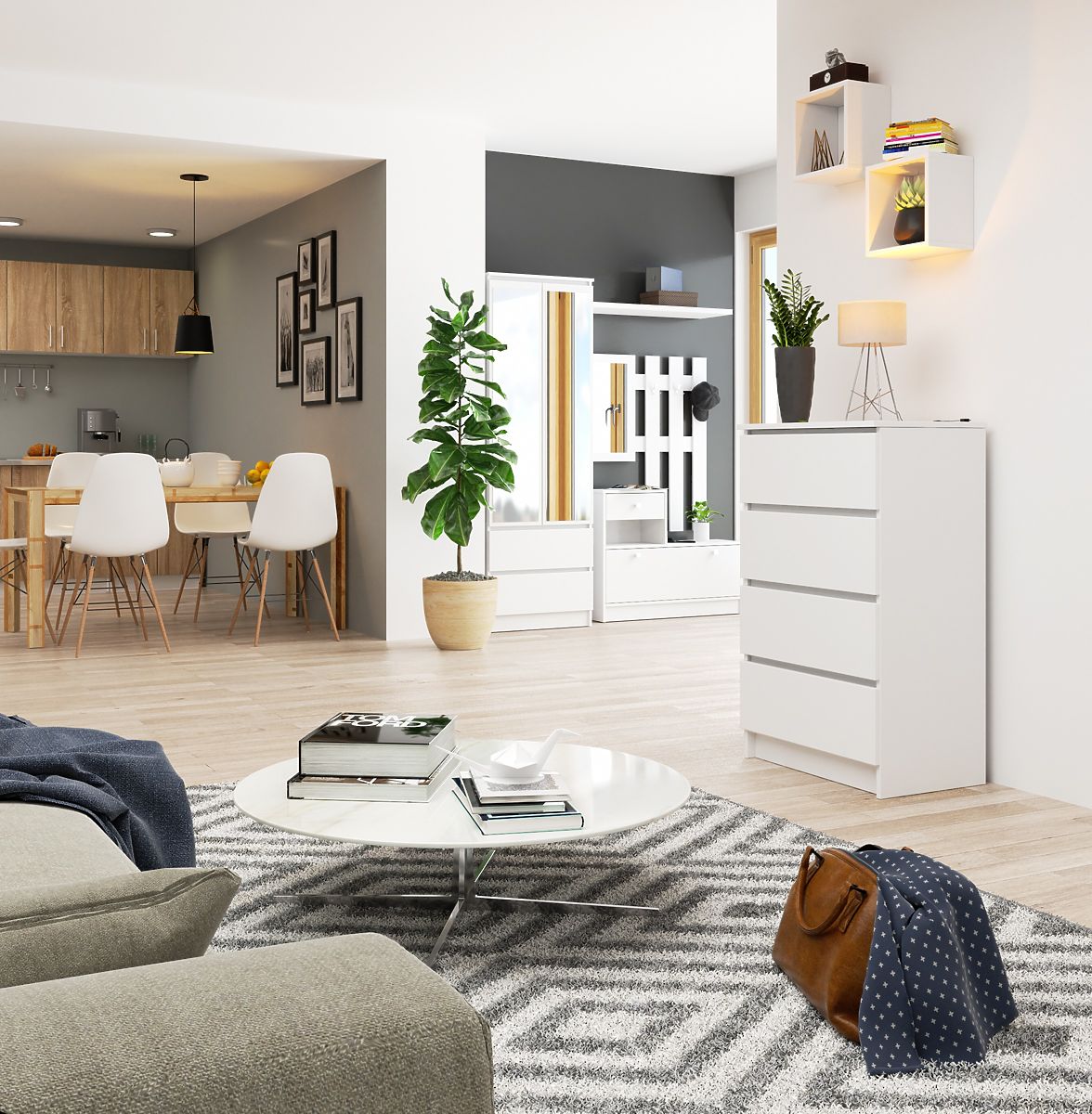 Wysoka komoda w białym kolorze to interesujący wybór, który można wykorzystać zarówno w przestrzeni mieszkalnej, jak i biurowej. Funkcjonalny mebel składa się z czterech szuflad wykonanych z laminowanej płyty o grubości 16 milimetrów. Materiał wykazuje wysoką odporność na ścieranie, co wpływa na trwałość i solidność komody. Uwagę przyciąga jej nowoczesny design - prostota i elegancja oraz minimalistyczny styl, w którym jest utrzymana. Tania, ale bardzo efektowna opcja z pewnością doskonale spełni swoją funkcję, umożliwiając przechowywanie wielu potrzebnych przedmiotów w przedpokoju, jadalni, salonie, pokoju młodzieżowym lub sypialni. Produkt przeznaczony do samodzielnego montażu charakteryzuje się niezwykle starannym i solidnym wykonaniem.