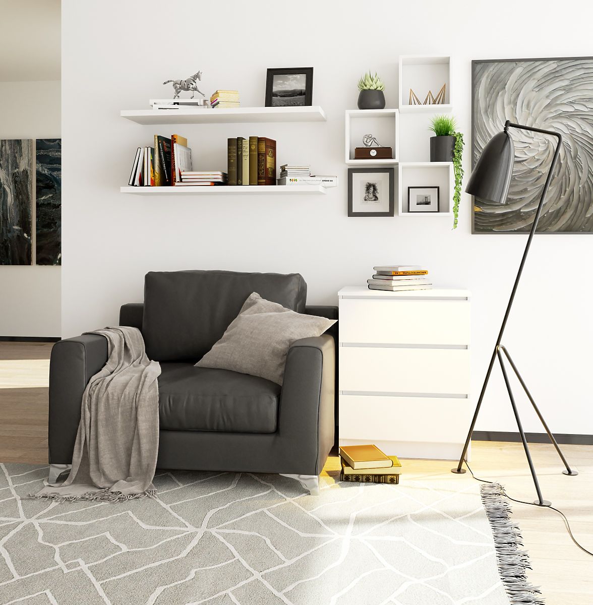 Biała komoda z trzema szufladami w stylu skandynawskim. .. więcej