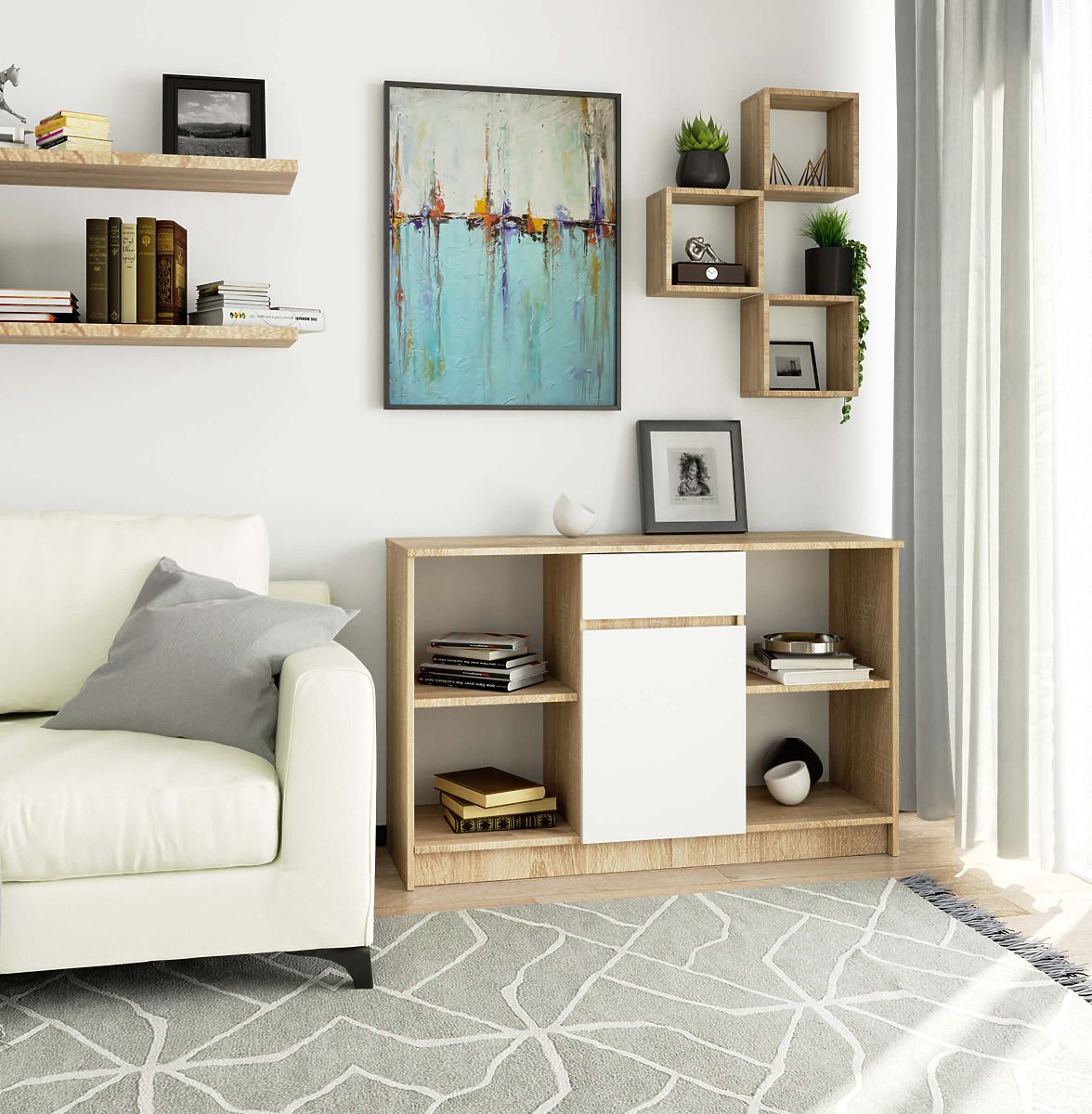 Przemyślane wykonanie komody B-17 czyni ją odpowiednią do pomieszczeń takich jak salon, sypialnia, przedpokój czy garderoba. Łączy otwarte półki z zamkniętą szafką i szufladą. Szuflada ma możliwość blokady, co umożliwia przechowywanie cennych rzeczy. To doskonałe miejsce na drobiazgi, pamiątki i różne dekoracje. Połączenie bieli i jasnego drewna czyni ją odpowiednią do nowoczesnych aranżacji.