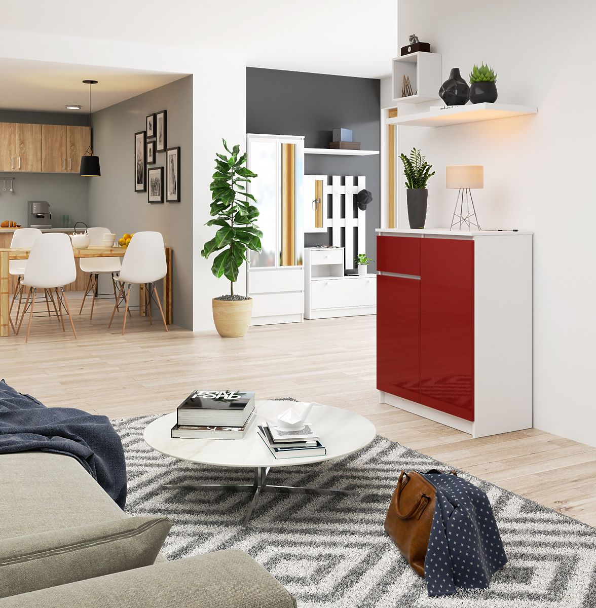 Komoda z czerwonymi błyszczącymi frontami i białym korpusem. .. więcej