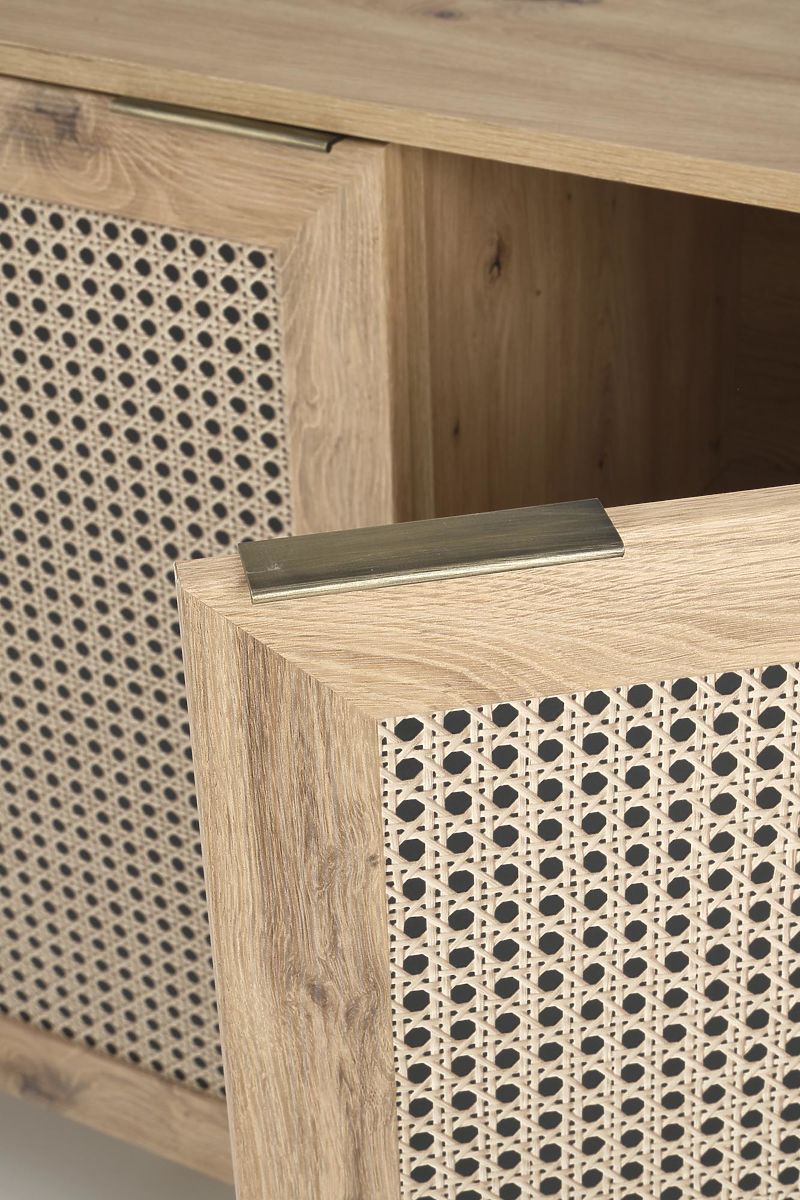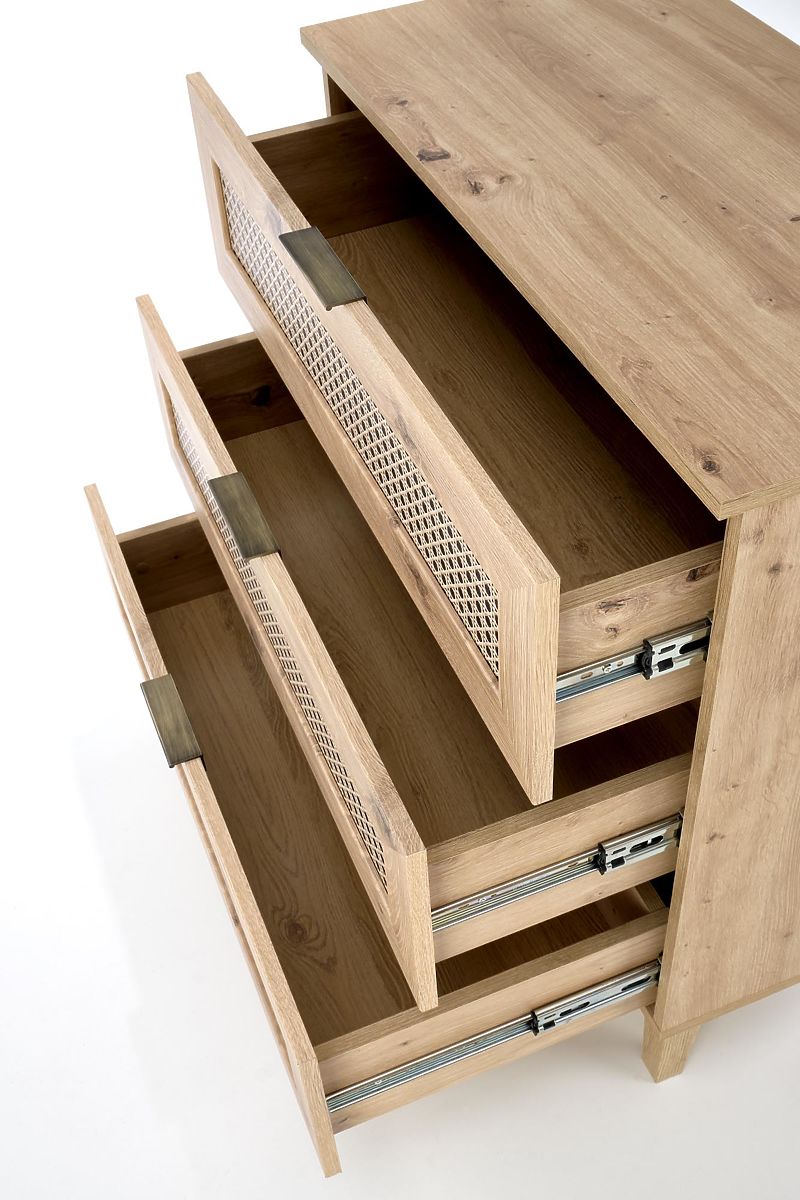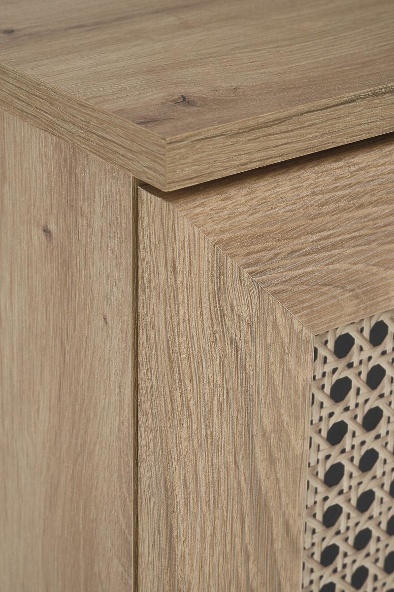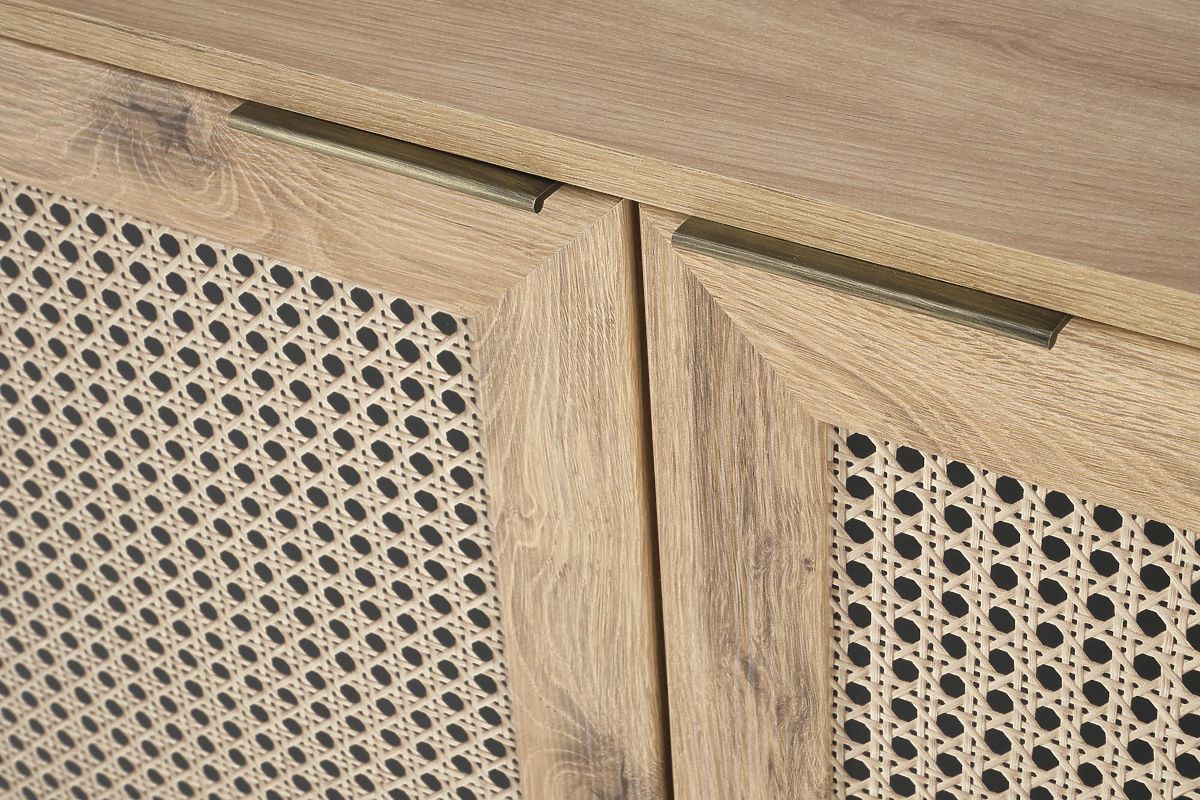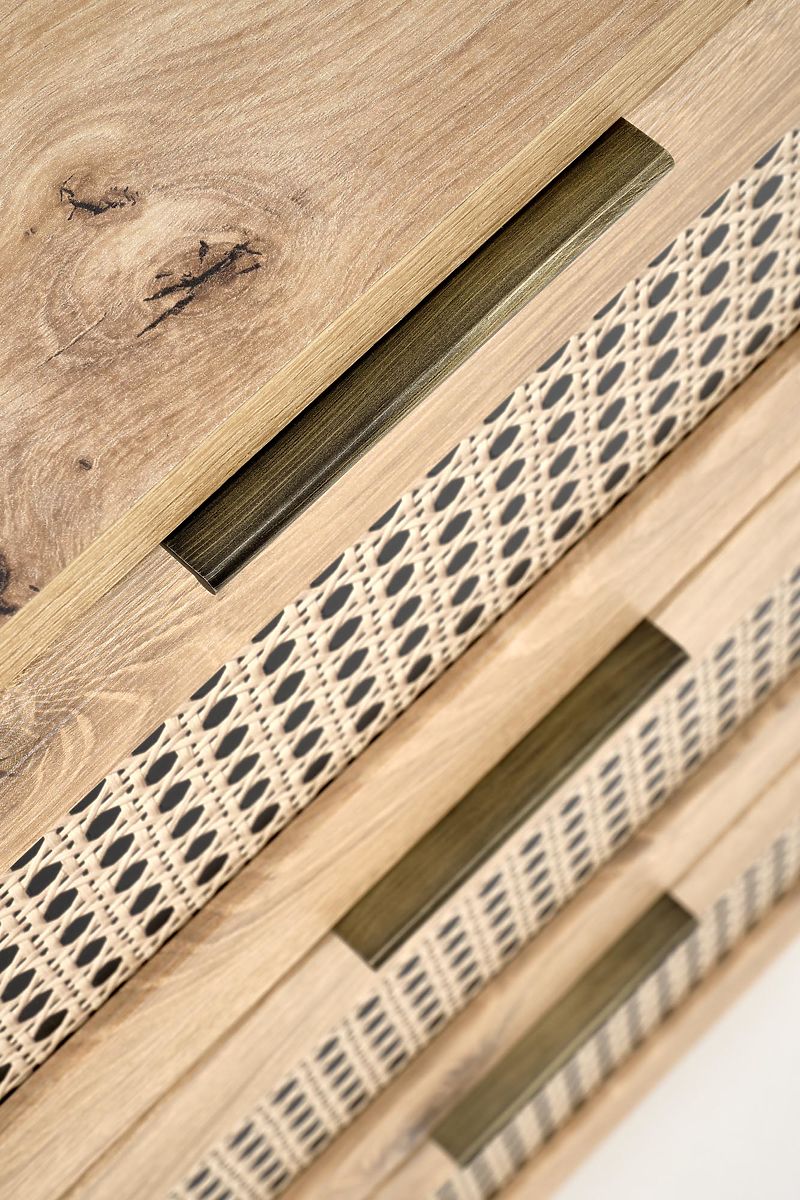 Dekor dąb artisan wraz z modnymi wstawkami we wzorze wiedeńskiego splotu nadaje komodzie unikalny boho charakter, który natychmiast przyciąga uwagę.