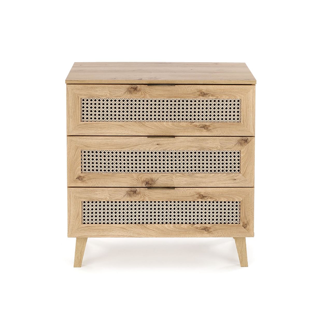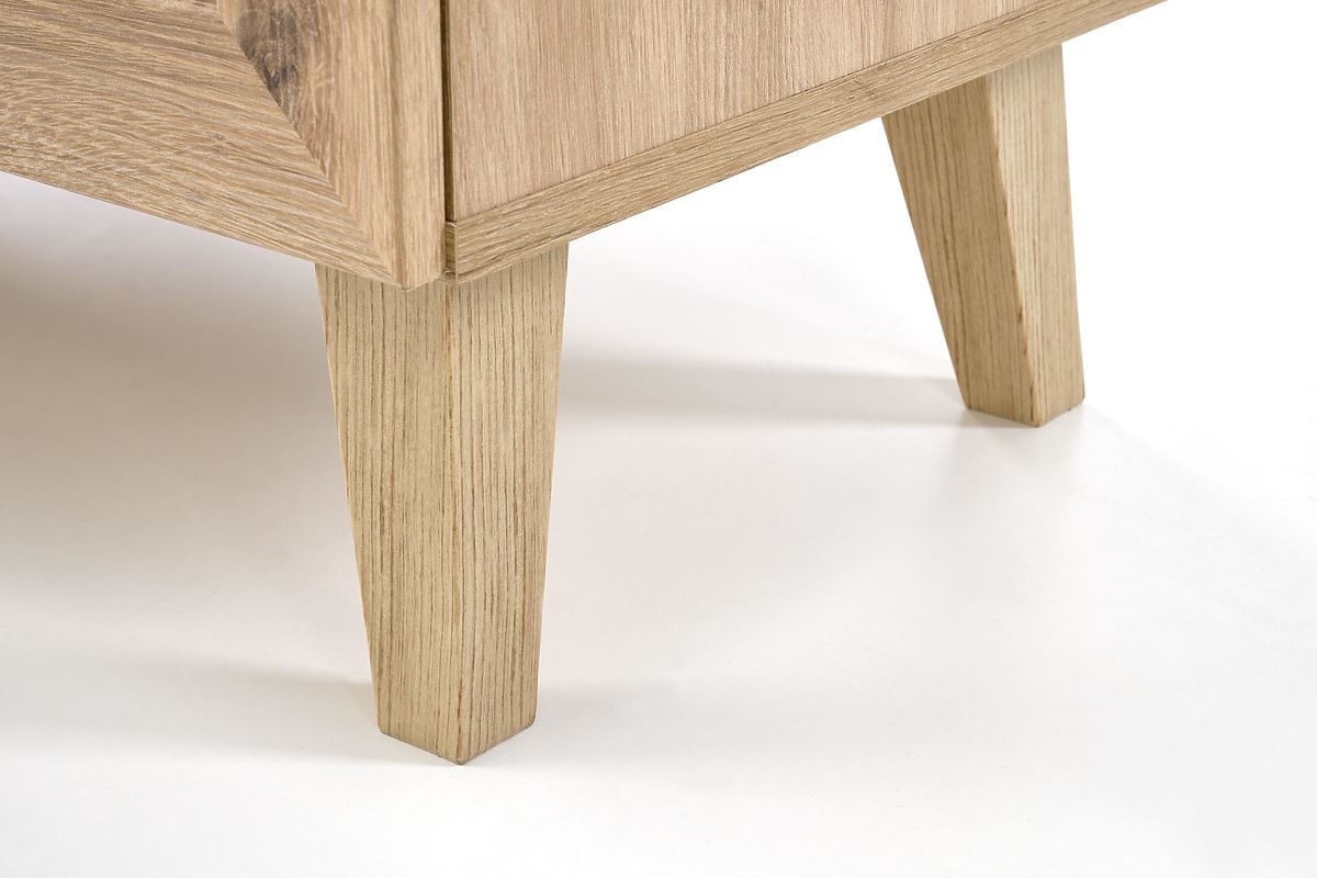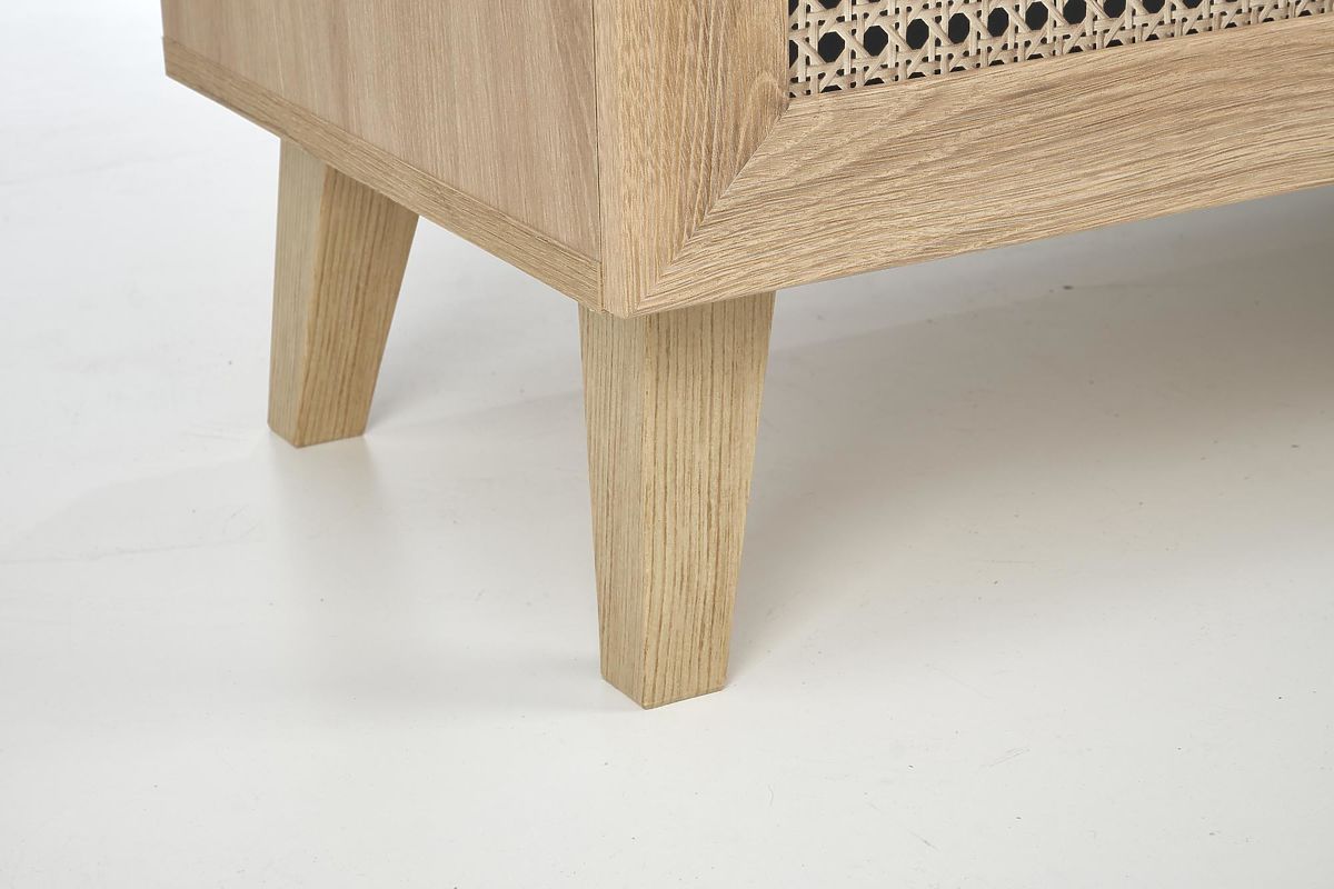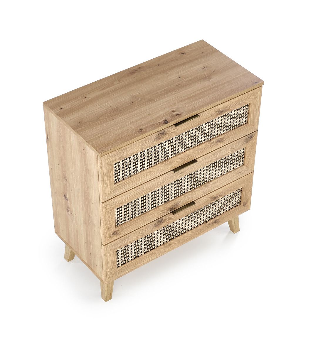 Dekor dąb artisan wraz z modnymi wstawkami we wzorze wiedeńskiego splotu nadaje komodzie unikalny boho charakter, który natychmiast przyciąga uwagę.