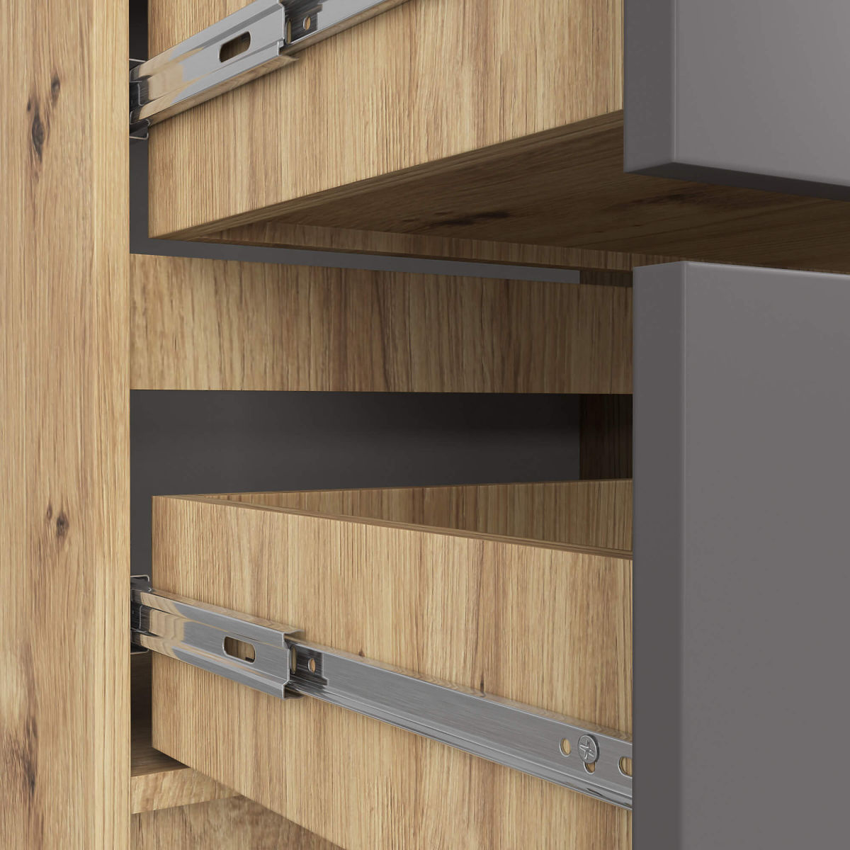 - Szuflady poruszają się na metalowych prowadnicach kulkowych - Krawędzie oklejone obrzeżem ABS zapewniającym wysoką ochronę przed uszkodzeniami