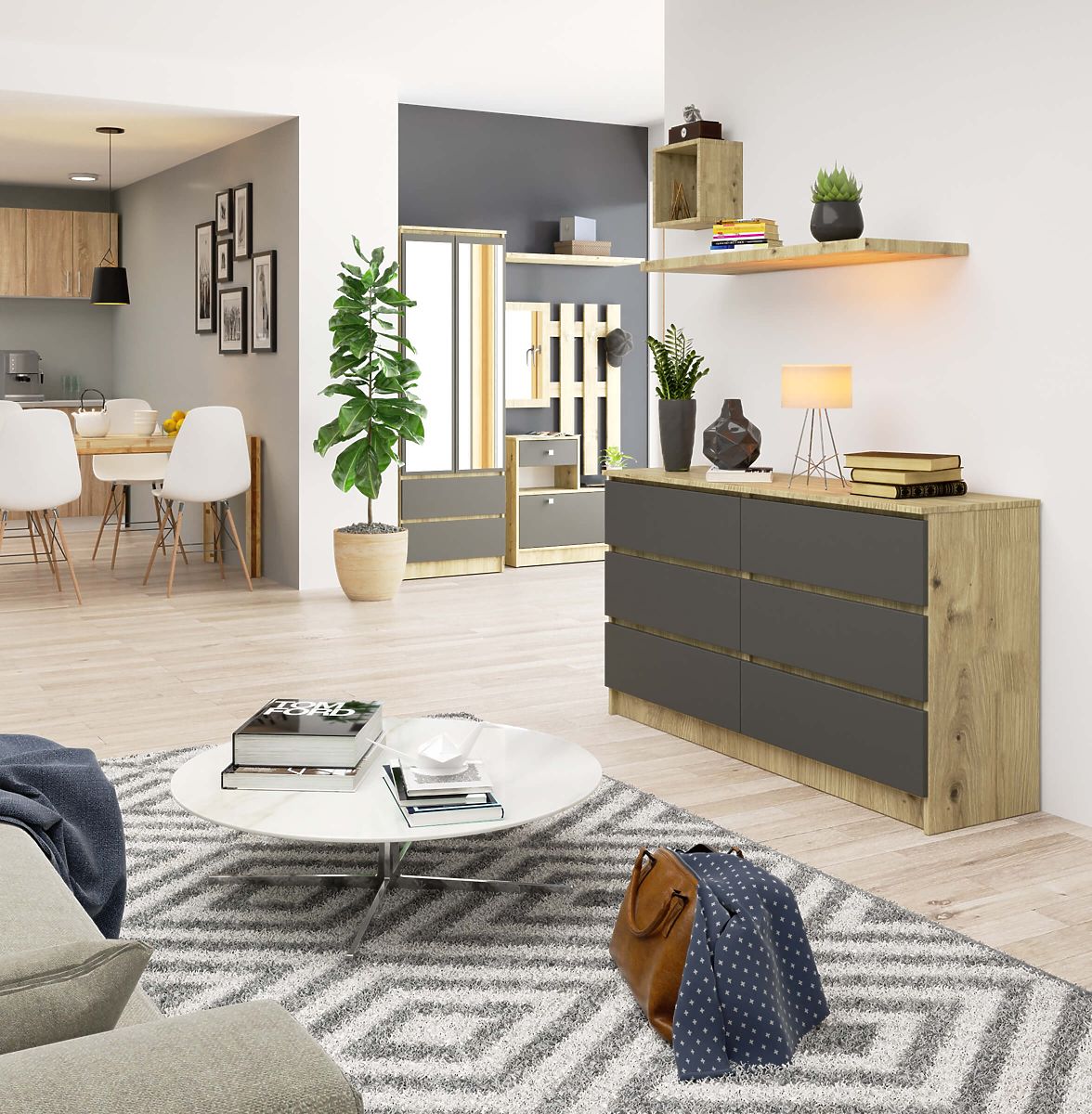 Komoda z sześcioma szufladami, dąb Artisan i szary grafit. .. więcej