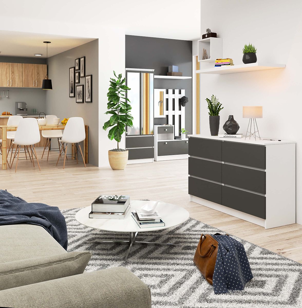 Komoda z 6 szufladami, biała z grafitowymi frontami. .. więcej