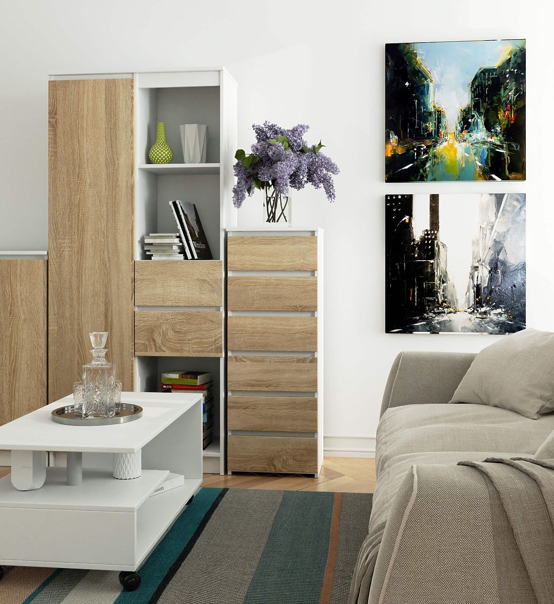 - elegancki wygląd - komoda jest prosta w formie, charakteryzuje się stylowym białym kolorem i frontami dąb sonoma,