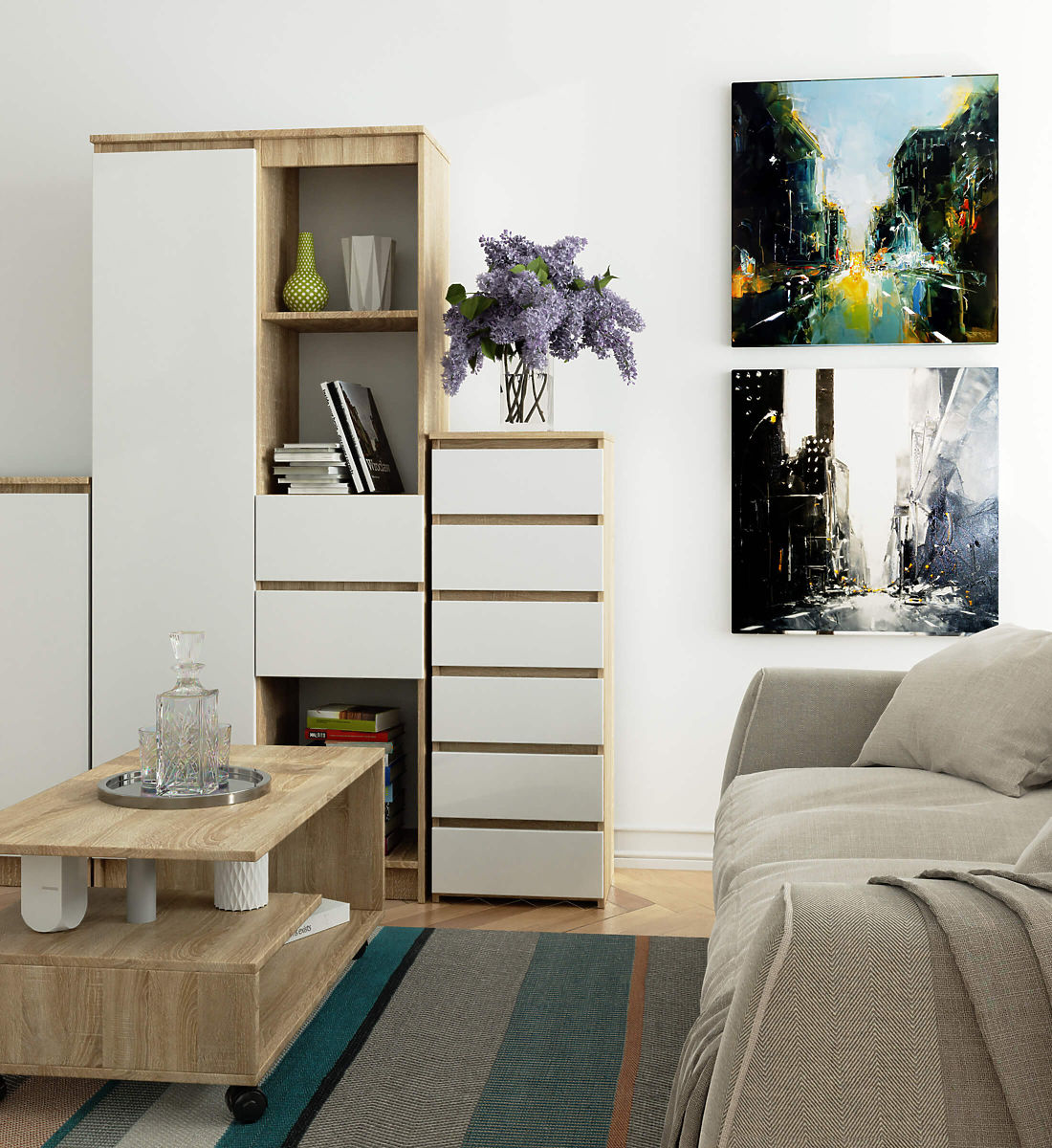 - elegancki wygląd - komoda jest prosta w formie, charakteryzuje się stylowym kolorem dąb sonoma i białymi frontami,
