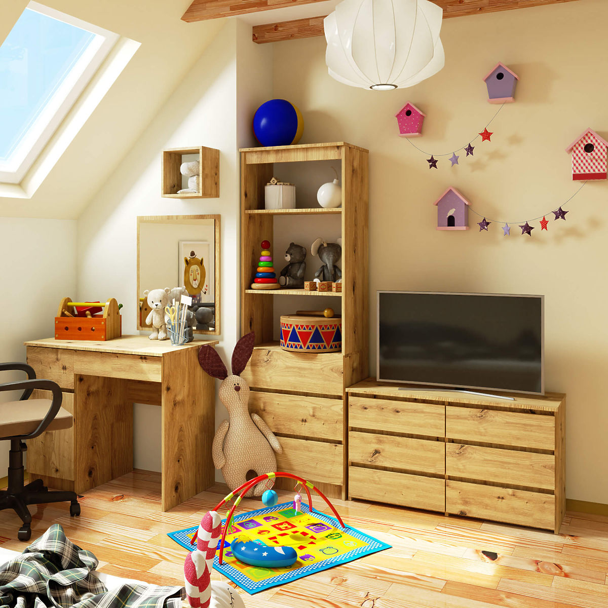 W meblarstwie szczególny nacisk kładzie się na funkcjonalność produktów i ich wysokie walory estetyczne. Doskonałym przykładem jest komoda CL 100 cm. Ten praktyczny mebel wykonany jest z laminowanej płyty odpornej na ścieranie, co gwarantuje jego trwałość i odporność. W sześciu przestronnych szufladach zmieszczą się różne książki, dokumenty lub drobiazgi. Niektórzy nasi klienci decydują się na przechowywanie odzieży lub bielizny. Komoda dąb artisan ma elegancki design. Prosta forma i eleganckie wykonanie pasują zarówno do klasycznych i eleganckich wnętrz, jak i do tych romantycznych. Ten wyjątkowy mebel doskonale pasuje do stylowego salonu i przytulnej sypialni. Jest także wykorzystywany jako część garderoby lub przedpokoju. Komoda z 6 szufladami jest ceniona zarówno przez indywidualnych klientów, jak i przedsiębiorców. Dzięki bezbłędnemu wyglądowi i niezwykłej pojemności doskonale nadaje się jako część wyposażenia biur.