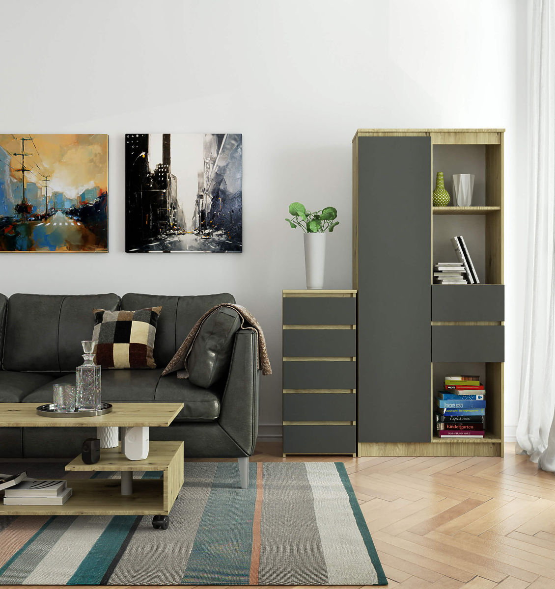 KOMODA CL5 5SZ DĄB ARTISAN / GRAFITOWY SZARY