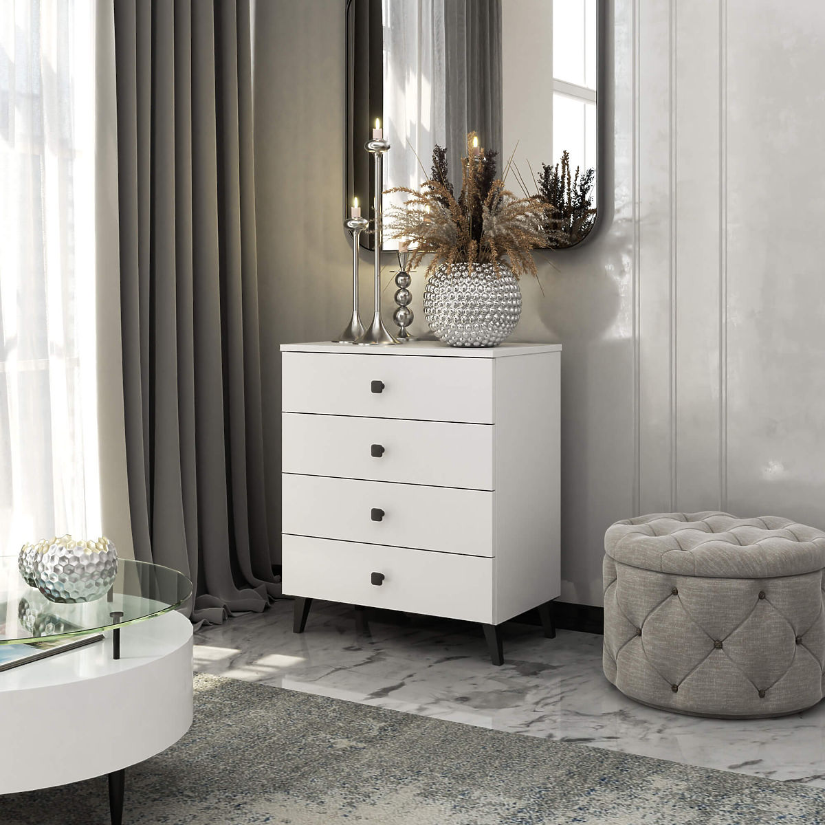 Mała komoda to element wyposażenia, który znajdzie zastosowanie w każdym pomieszczeniu. Nowoczesne kolory, solidna konstrukcja i staranne wykonanie doprowadziły do stworzenia szafki, która pasuje na przykład do przedpokoju, salonu, pokoju dziecięcego, a także do sypialni. Może być również używana w przestrzeniach biurowych, gdzie umożliwi przechowywanie licznych dokumentów i innych materiałów biurowych. Komoda składa się z 4 szuflad. Mebel łączy białą i czarną kolorystykę.