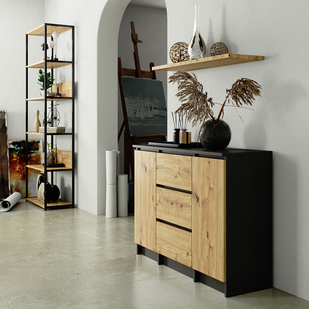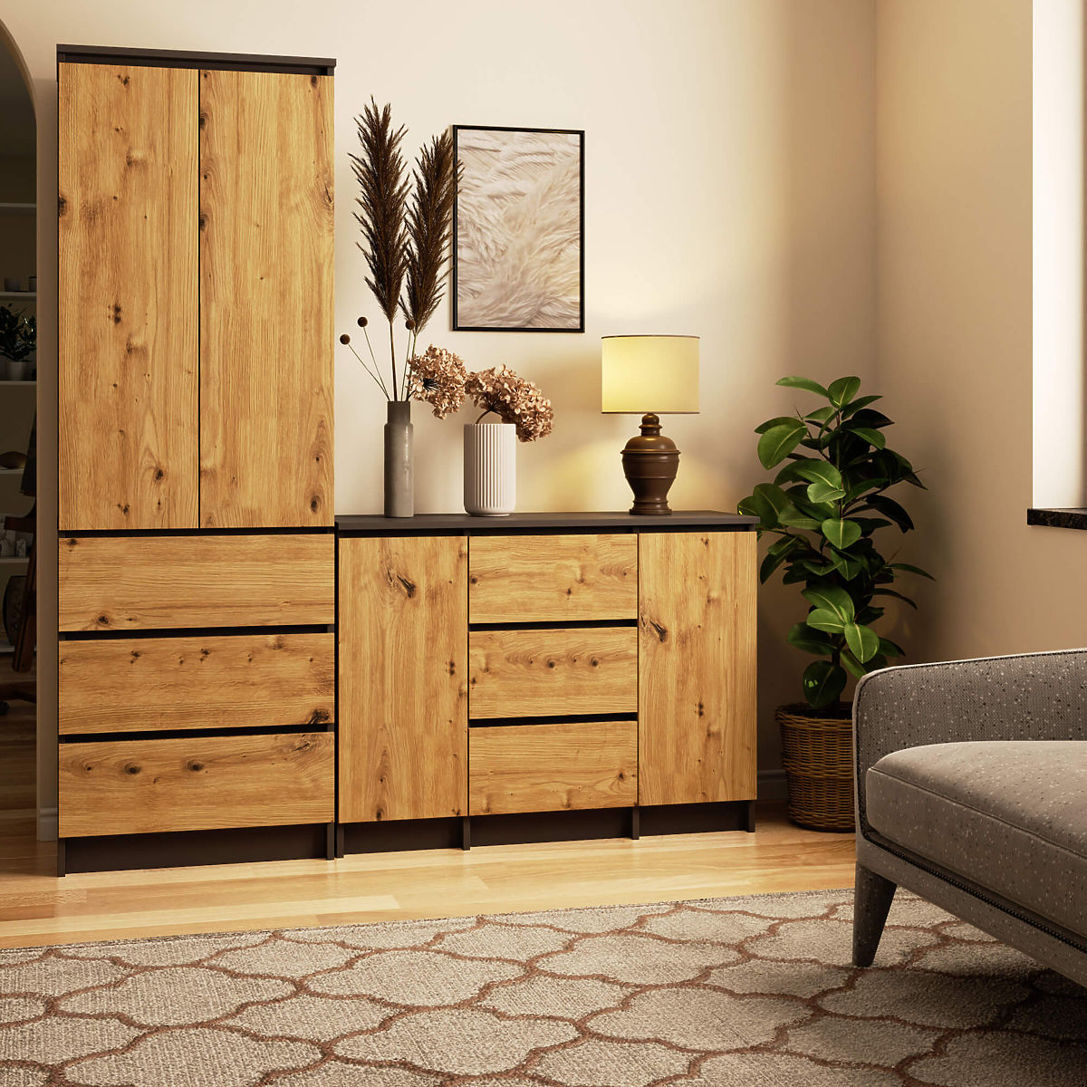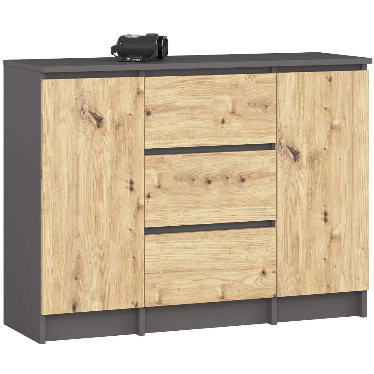 Komoda z trzema szufladami i dwoma drzwiami w kolorze grafitowym i dębowym. .. więcej