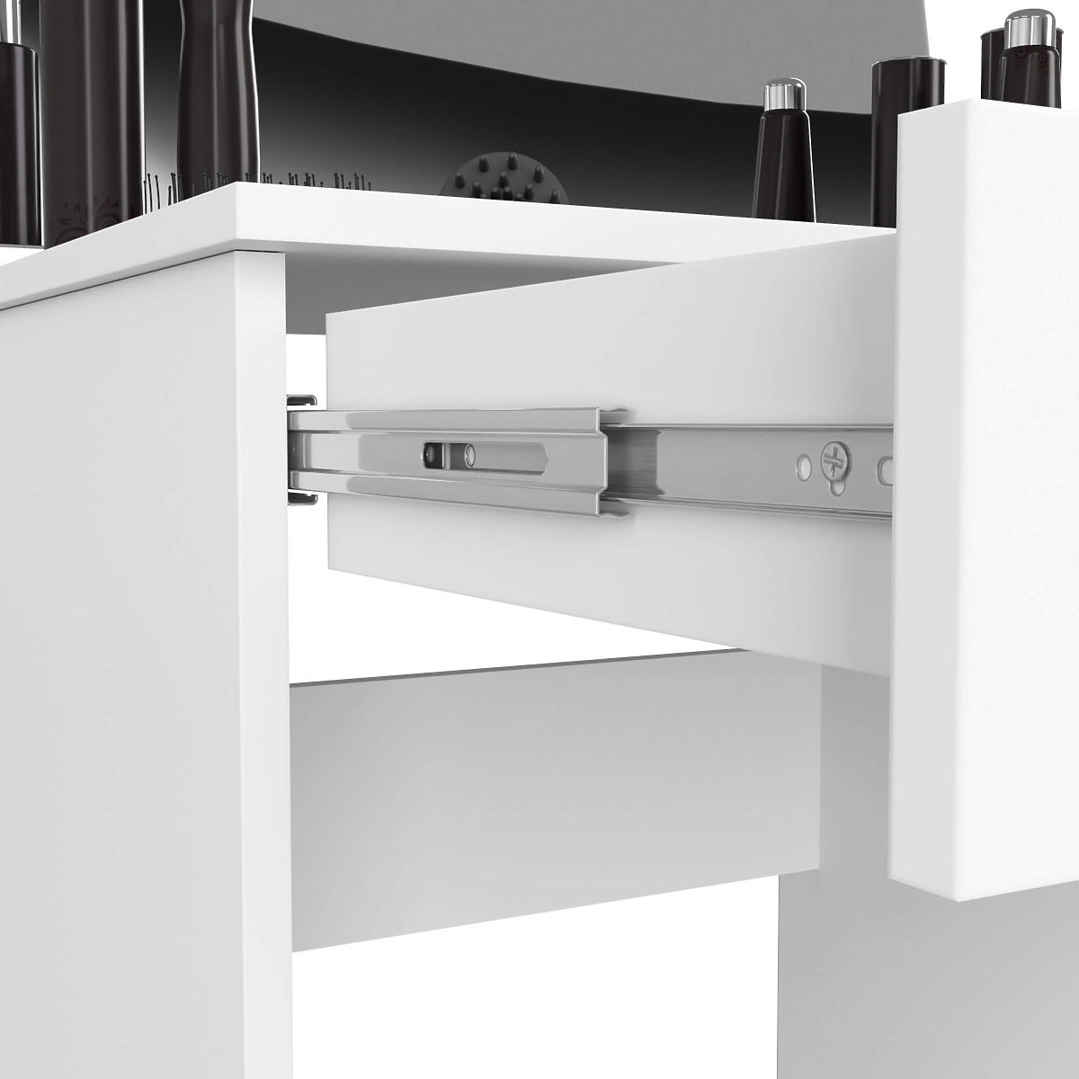 Toaletka z lustrem w białym odcieniu z szufladami i przestronnym miejscem za drzwiami.