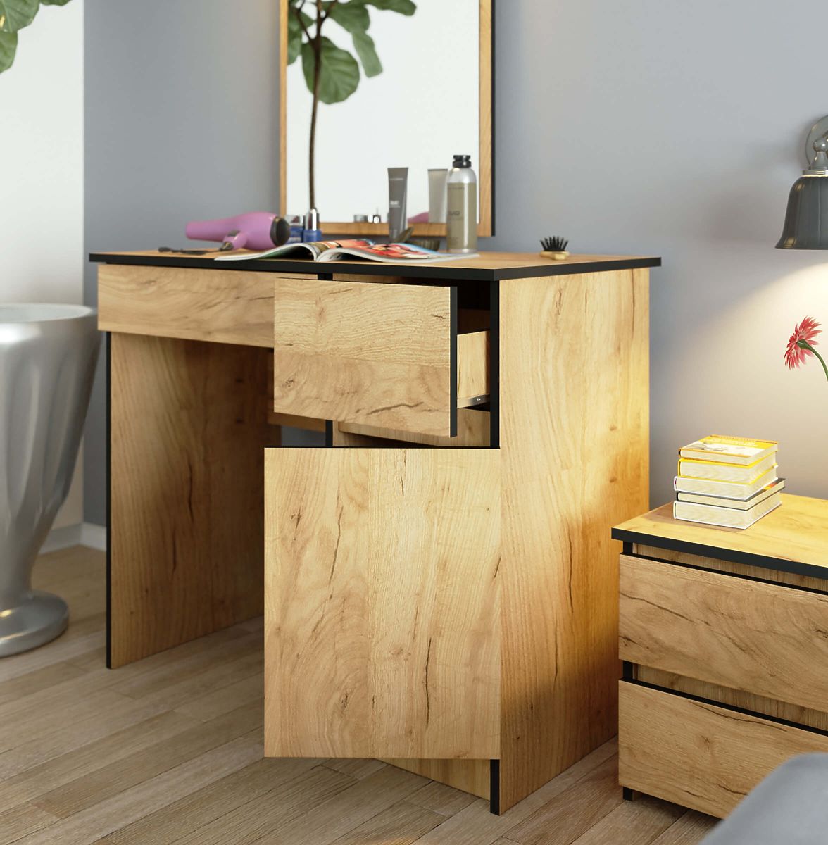 Toaletka z lustrem w kolorze dąb craft z szufladami i pojemnym miejscem za drzwiczkami.