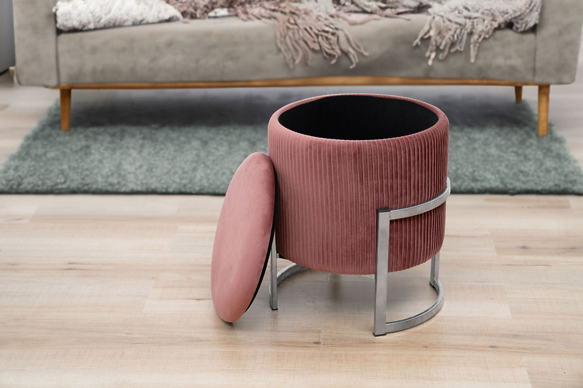 Podnóżek lub pufa to doskonały dodatek do salonu lub sypialni. Dzięki niemu zmęczone nogi po całym dniu chodzenia mogą odpocząć, a gdy pufa jest wykonana z miękkiego weluru, tylko potęguje to przyjemne uczucie relaksu. Nowoczesny wygląd uzupełniają detale, w naszej pufie zastosowaliśmy metalową podstawę w kolorze srebrnym. Otwierana pokrywa zapewnia dostęp do przestrzeni do przechowywania, gdzie można schować przedmioty, które nie są potrzebne do codziennego użytku.Specyfikacja: