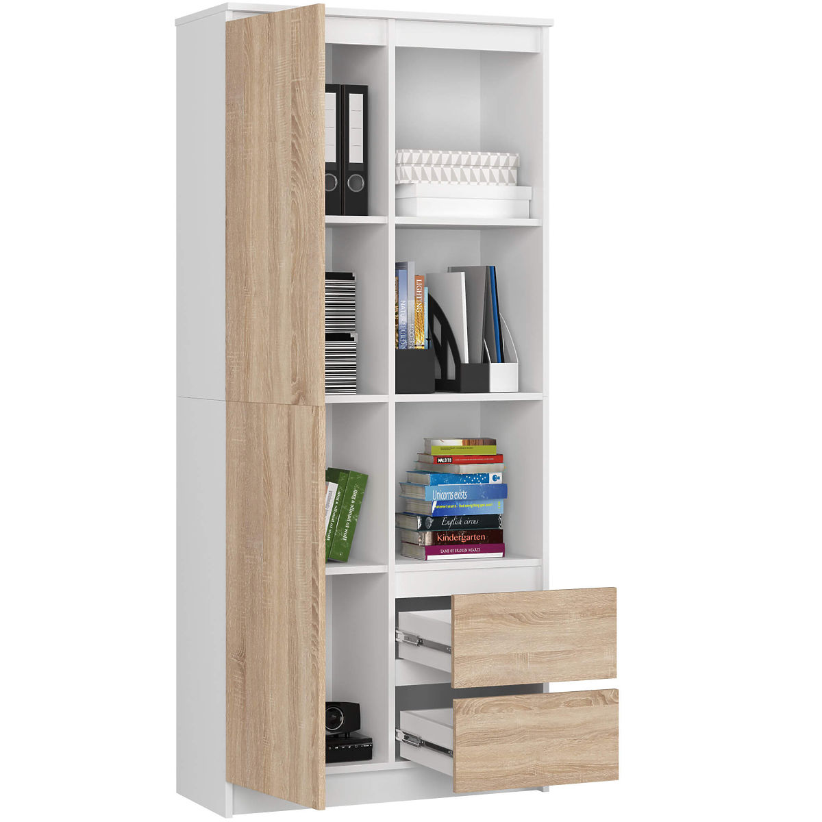 Regał biurowy z drzwiami i szufladami w połączeniu kolorów białego i sonoma.