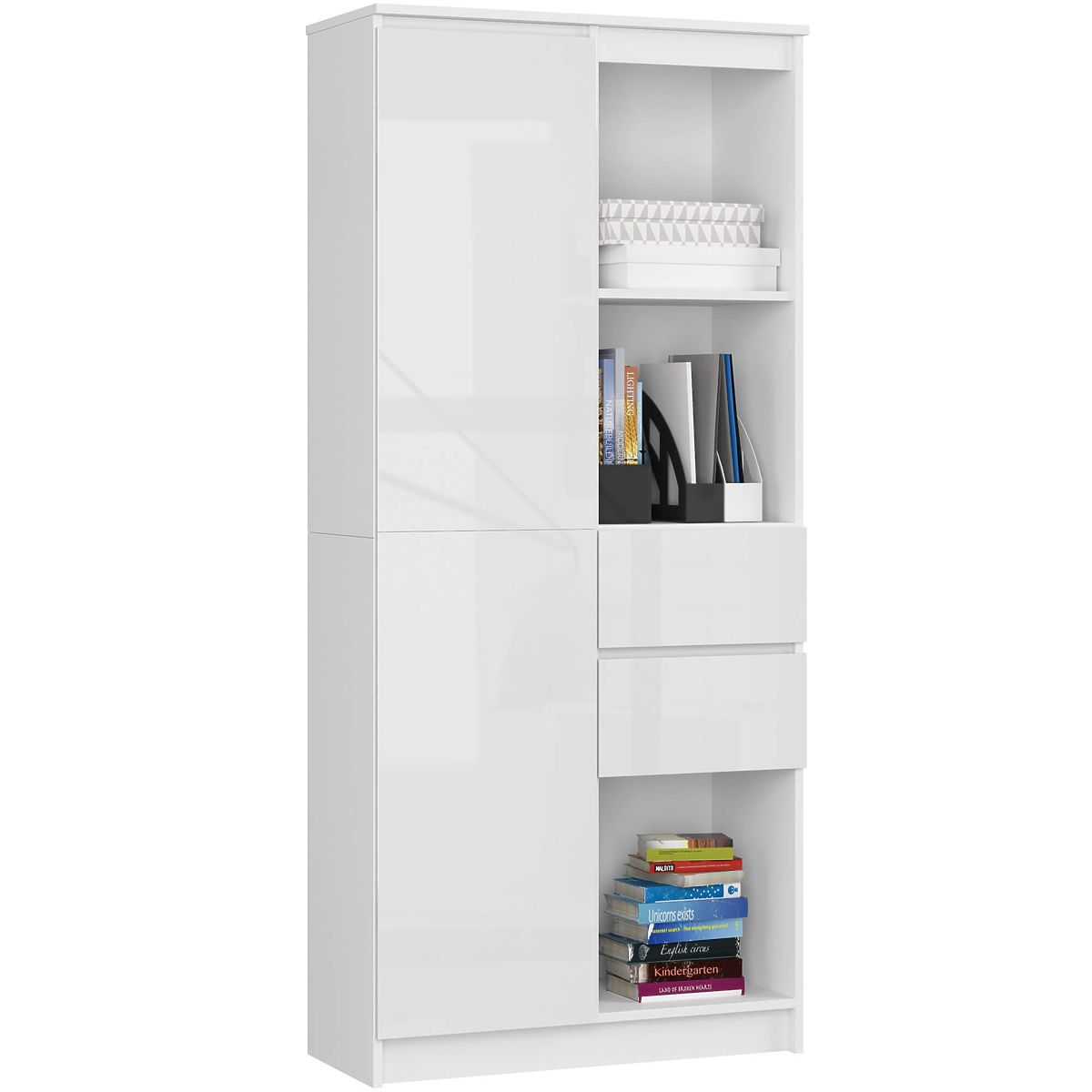 Biały regał biurowy z frontami w połysku i 6 półkami. .. więcej
