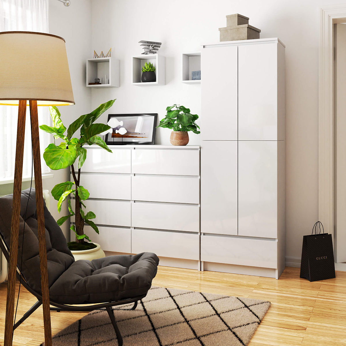 Biała biblioteka biurowa z szufladą to doskonałe połączenie funkcjonalności i atrakcyjnego wyglądu. Mebel jest praktyczny i łatwy do utrzymania w idealnej czystości, a jednocześnie bardzo efektowny. W zamkniętej części znajdują się przestronne półki, natomiast w dolnej części znajduje się przestronna i łatwo wysuwana szuflada. Zastosowanie biblioteki jest bardzo uniwersalne i zależy od indywidualnych potrzeb. W szafie można przechowywać książki, segregatory z dokumentami i artykuły biurowe, a także można ją używać do przechowywania naczyń stołowych, obrusów czy ręczników. Kolor klasycznej bieli i prosty kształt biblioteki zapewniają, że mebel pasuje do każdego wnętrza, niezależnie od koloru ścian czy stylu, w jakim jest urządzony. Mebel wykonany jest z trwałego materiału, jakim jest laminowana płyta odporna na zużycie i uszkodzenia. Krawędzie szafy pokryte są trwałym i estetycznym obrzeżem ABS. Fronty biblioteki są lakierowane na wysoki połysk, co dodaje meblowi dodatkowej elegancji. Górne i dolne drzwi są połączone w jedną całość i nie są otwierane osobno.