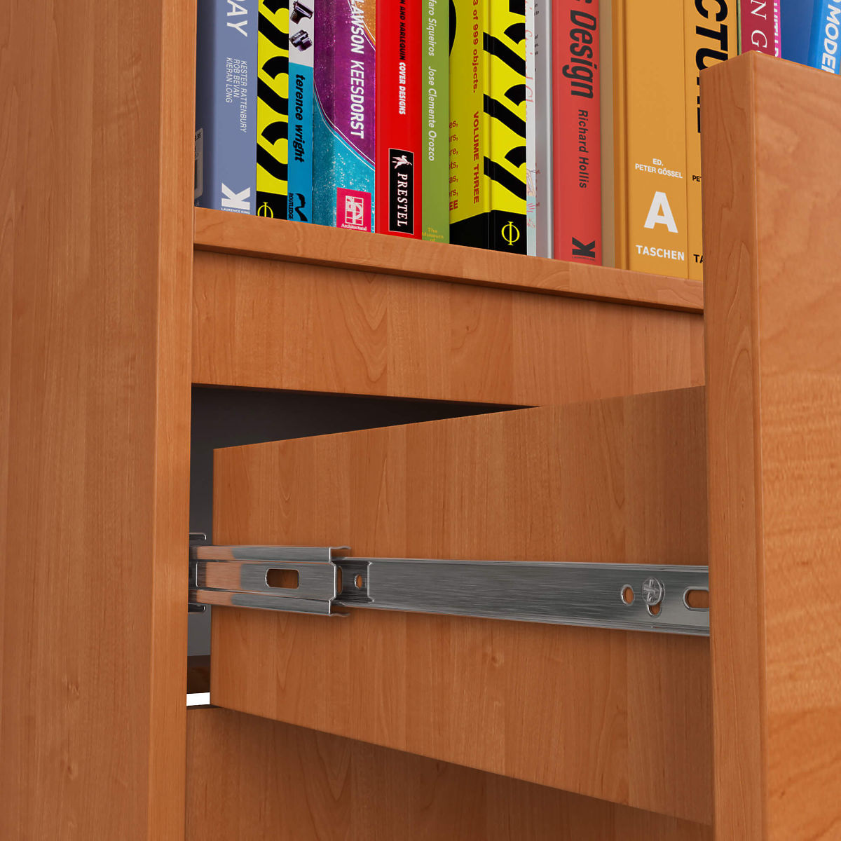 - Szuflada porusza się na metalowych prowadnicach kulkowych z blokadą wysuwu