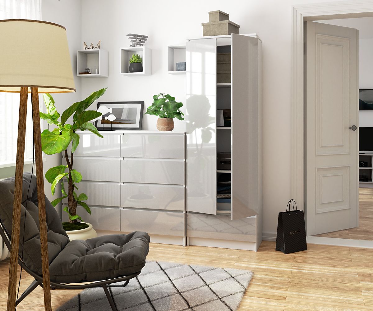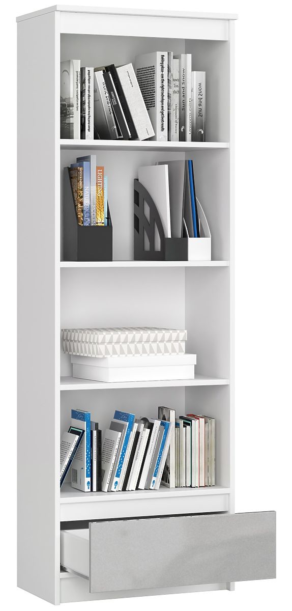 Regał to mebel, który znajdzie zastosowanie w każdym domu. Może służyć do przechowywania książek, teczek i segregatorów z dokumentami, albumów fotograficznych, a także ramek, pamiątek czy wielu innych przedmiotów. Najczęściej można go zobaczyć w pokoju młodzieżowym, salonie lub domowym biurze, ale doskonale nadaje się również do przestrzeni biurowych. Prezentowany regał to połączenie dobrej ceny, funkcjonalności, jakości i designu. Zasługuje na uznanie dzięki połączeniu dwóch najmodniejszych i jednocześnie ponadczasowych kolorów - białego i szarego. Regał składa się z czterech dużych półek i przestronnej szuflady. Szafa jest bardzo stabilna, charakteryzuje się solidną konstrukcją i dbałością o detale. Wykonana jest z laminowanej płyty o ponadprzeciętnej trwałości i odporności na ścieranie. Fronty zaprojektowane są w szarym kolorze z połyskiem, co nadaje całości unikalny charakter. Zapraszamy również do zapoznania się z innymi elementami mebli biurowych z tej kolekcji.