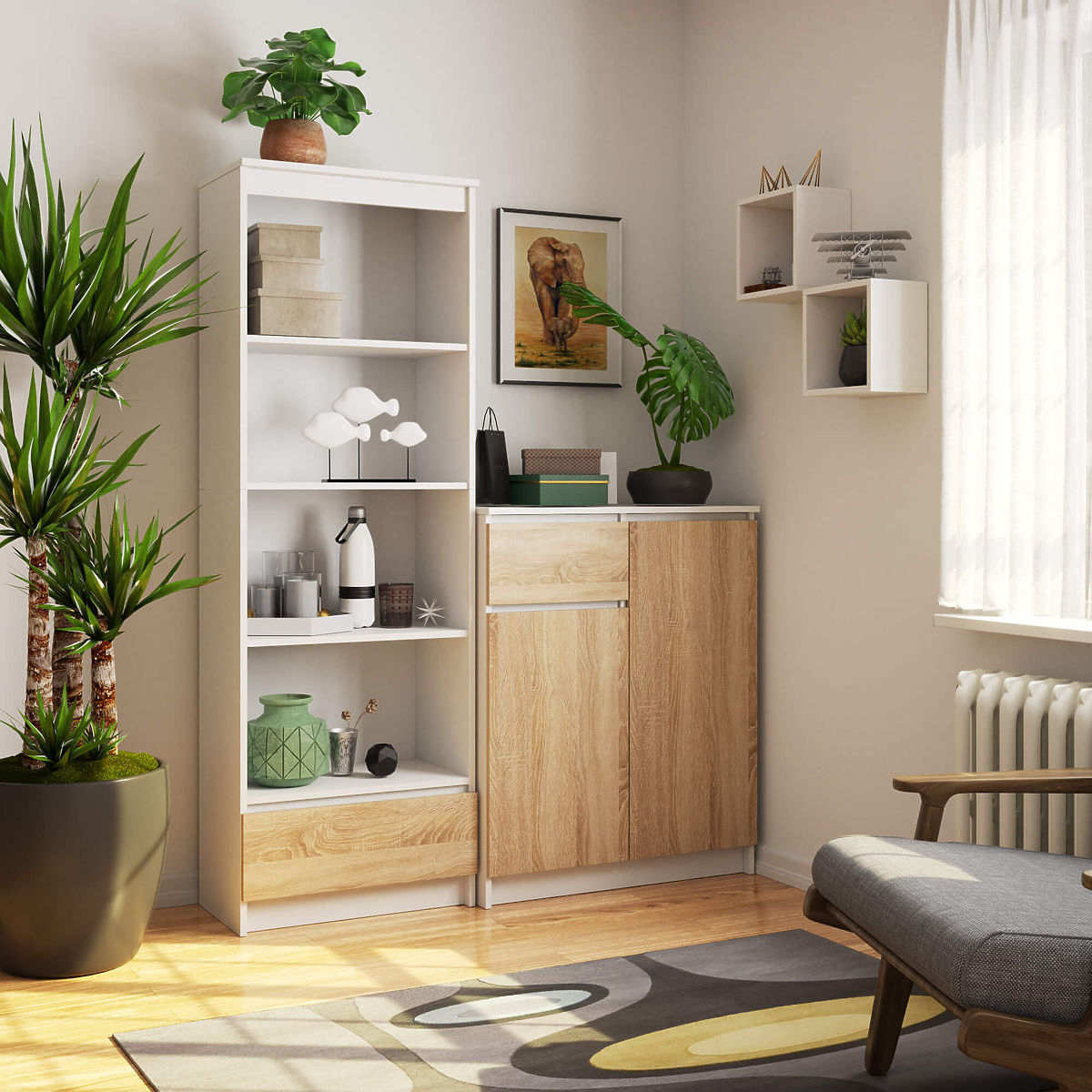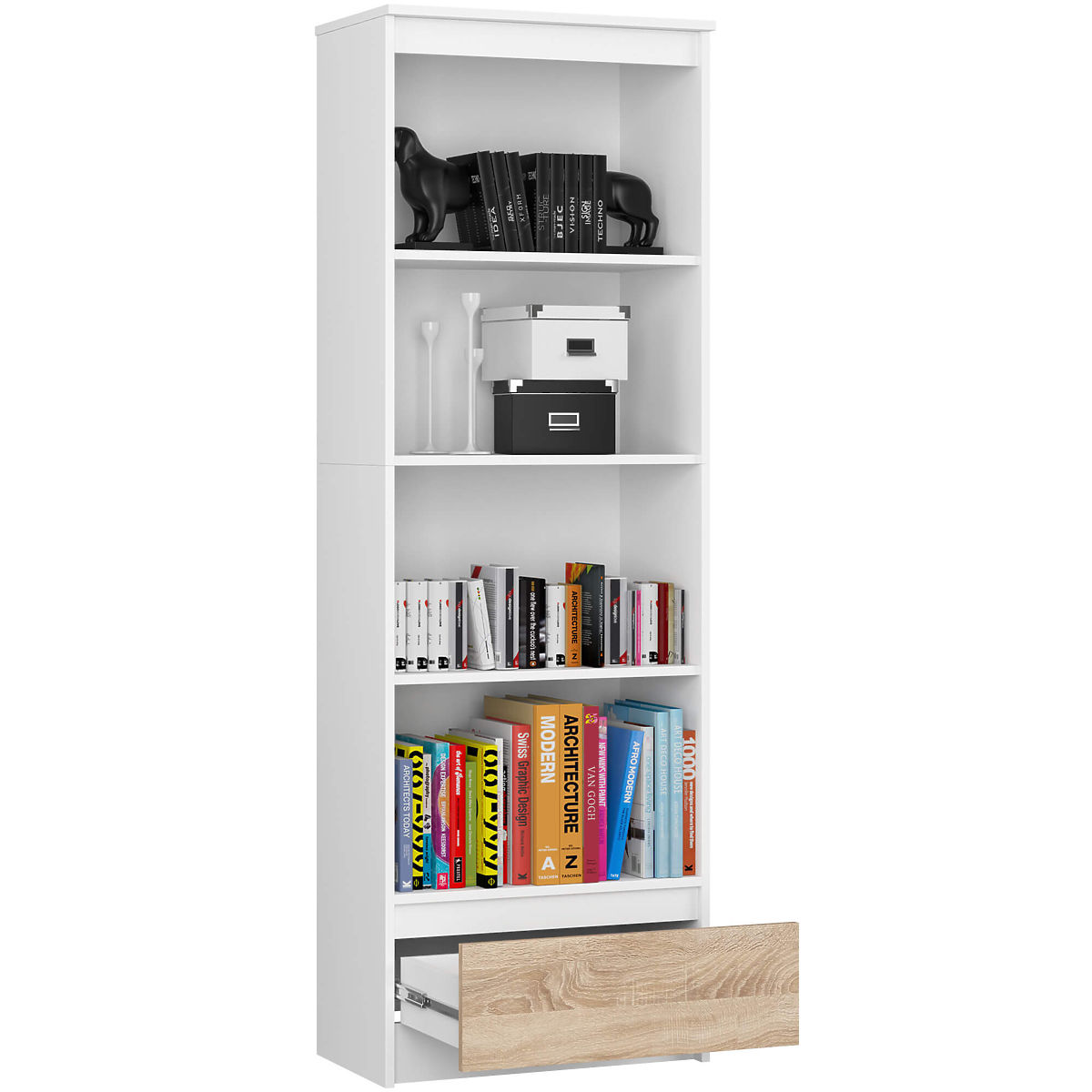 Regał z 3 półkami i wysuwaną szufladą, w kolorze białym i dębu Sonoma. .. więcej