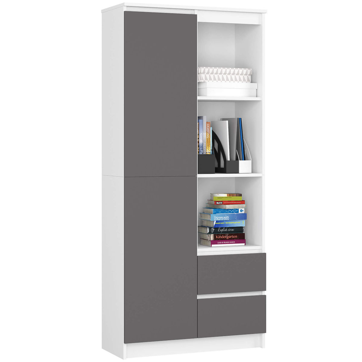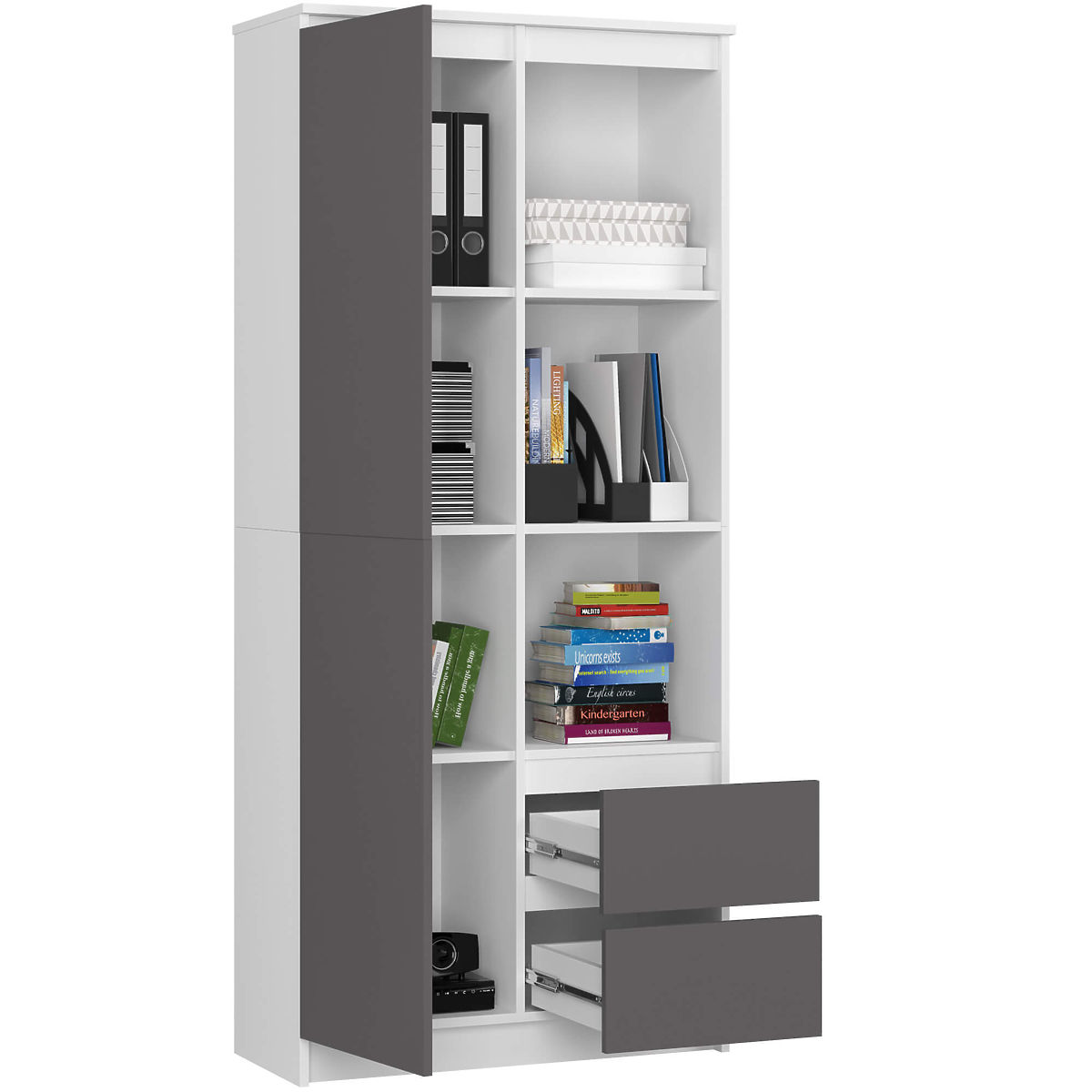 Regał biurowy z drzwiami i szufladami w połączeniu białego i grafitowego szarego koloru.