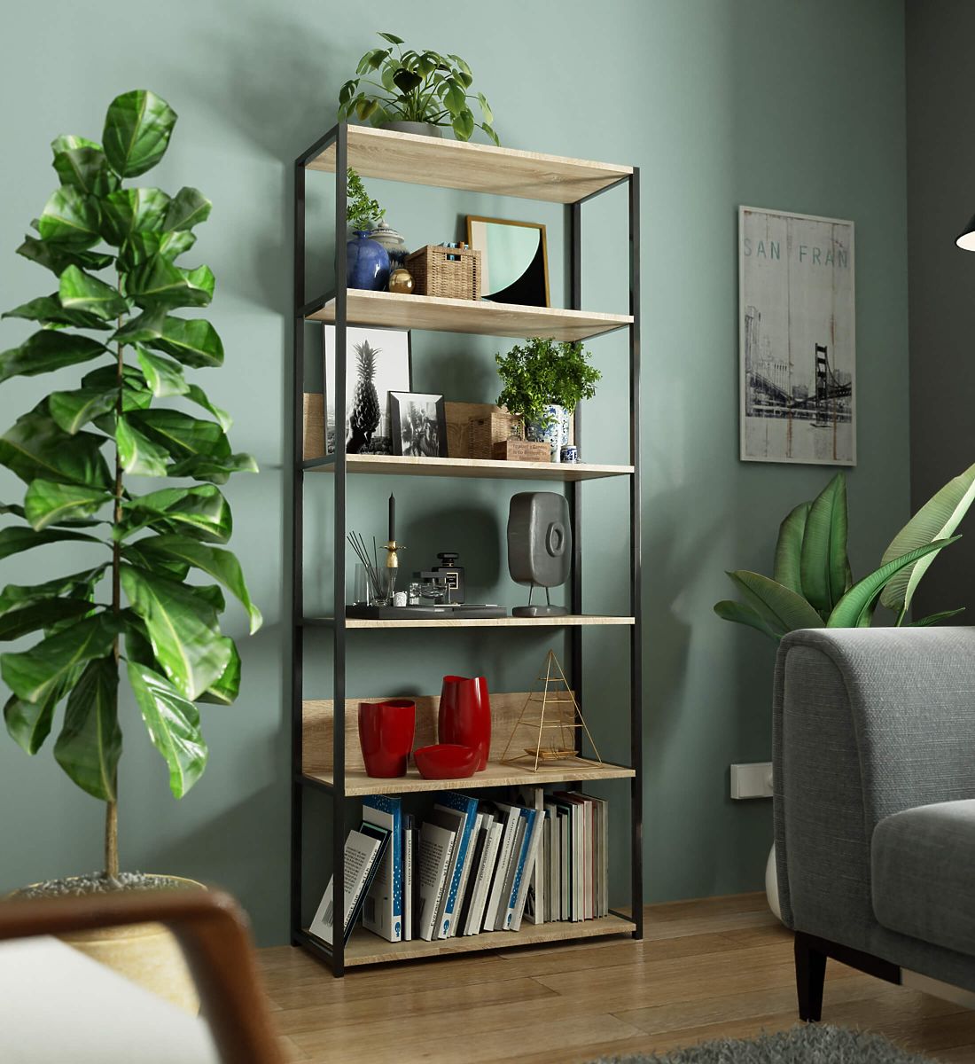 Metalowy regał loftowy to praktyczny i nowoczesny mebel, który pasuje zarówno do salonu, jak i do biura. Regał z czarną metalową ramą i 6 półkami w kolorze dąb sonoma. Półki regału wykonane są z laminowanej płyty o grubości 16 mm. Jest to trwały i odporny materiał, który charakteryzuje się wysoką odpornością na ścieranie. Krawędzie są dodatkowo chronione obrzeżem ABS, dzięki czemu mebel będzie wyglądał dobrze nawet przy bardzo intensywnym codziennym użytkowaniu. Regał wyposażony jest w 6 półek, na które można umieścić przedmioty, które chcemy wyeksponować lub mieć pod ręką. Całość prezentuje się bardzo stylowo i nowocześnie.