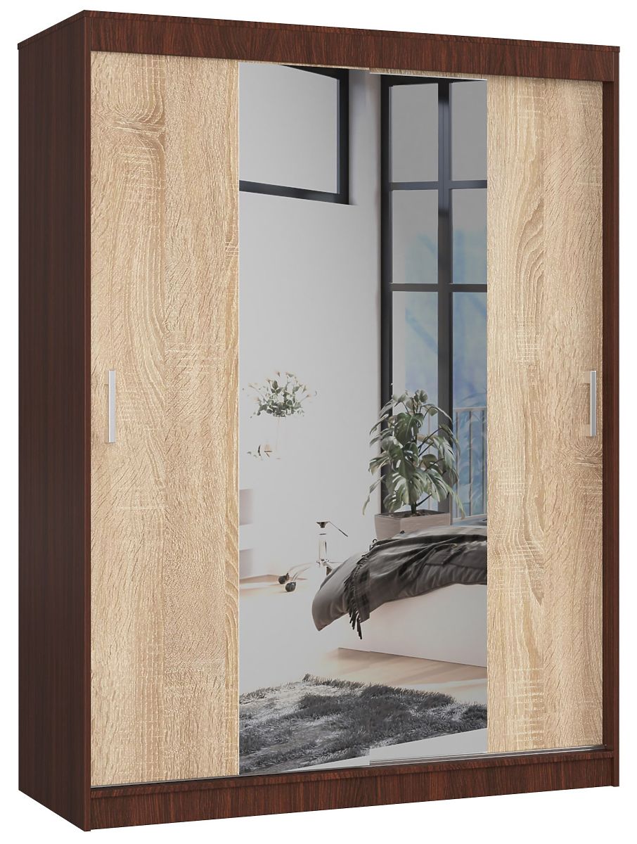 Duża szafa wyposażona w przesuwne drzwi z łatwością pomieści wszystkie ubrania, obuwie, torebki i wiele innych potrzebnych rzeczy w sypialni lub przedpokoju. Prezentowany model 150 cm CLP z lustrem jest przeznaczony dla miłośników wciąż popularnej kombinacji kolorystycznej wenge/sonoma. Mebel charakteryzuje się wysoką jakością wykonania z trwałych i odpornych materiałów. Jest to propozycja, którą można śmiało wykorzystać nie tylko w przestrzeni mieszkalnej, ale także na przykład w biurze. Szafa najczęściej używana jest w sypialniach, gdzie umożliwia przechowywanie przede wszystkim odzieży - zarówno na licznych półkach, jak i na praktycznym drążku.