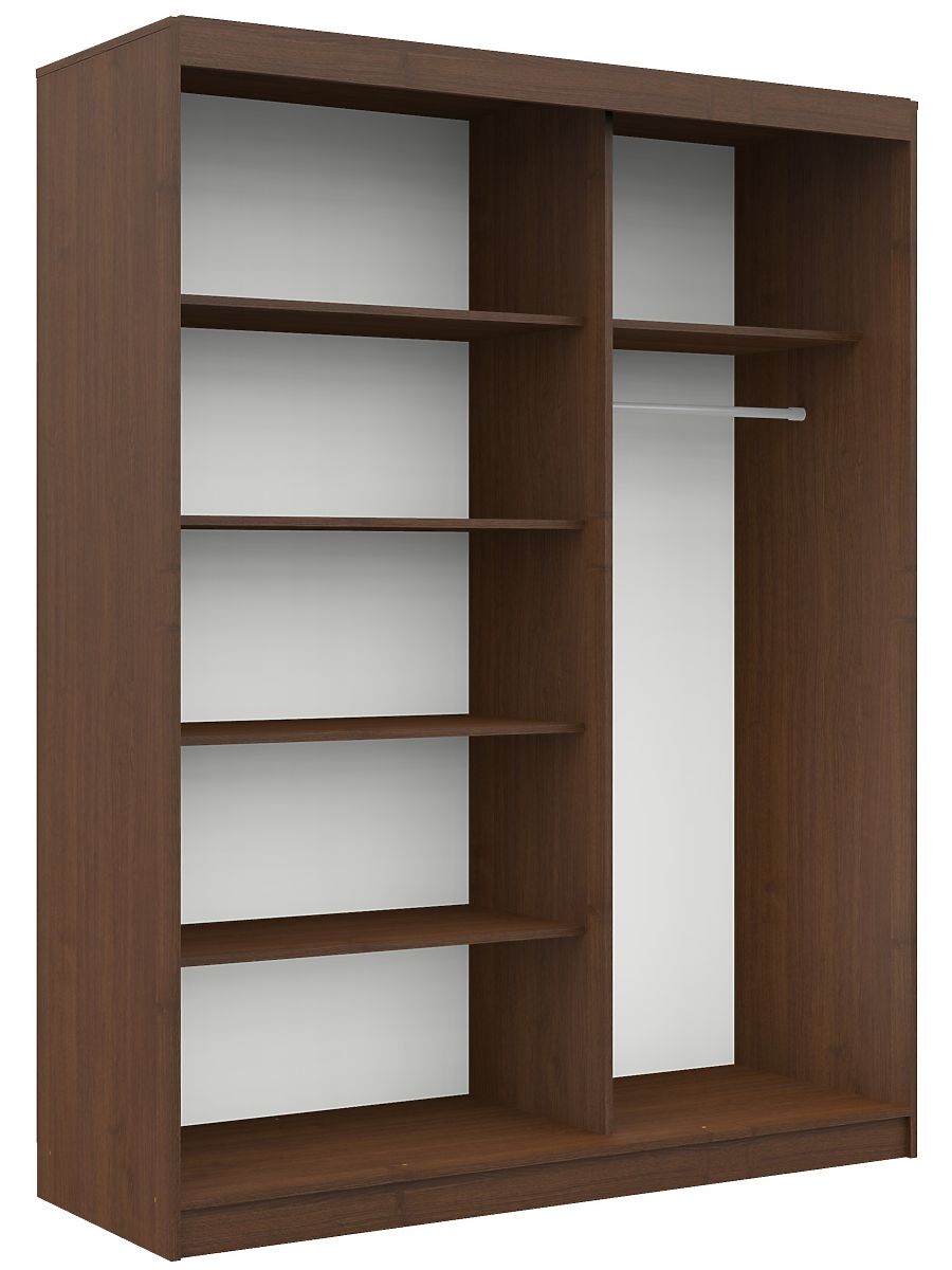 Przesuwna szafa w kolorze wenge z białymi frontami o długości 150 cm z półkami i drążkiem na ubrania. Duża powierzchnia do wykorzystania.