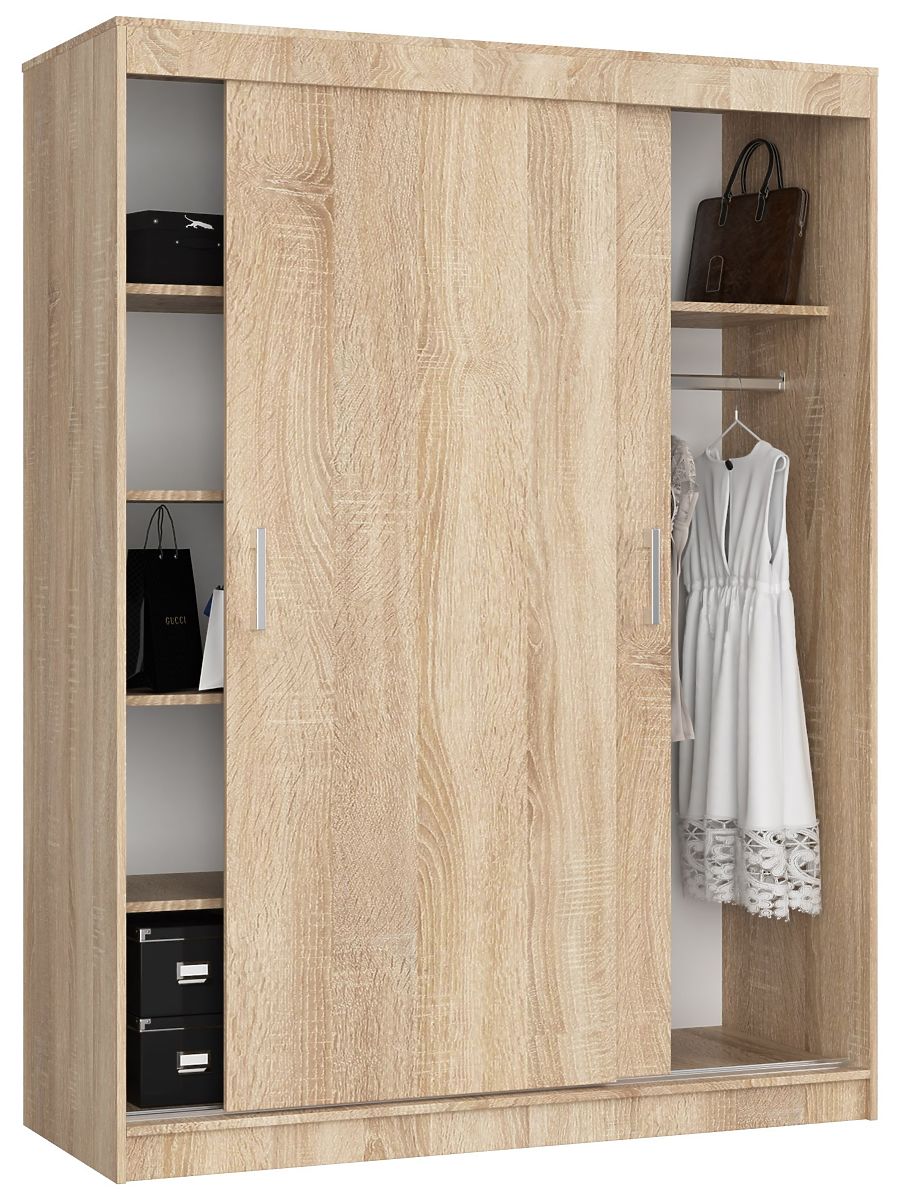 Przy zakupie szafy kierujemy się tym, aby była praktyczna i pomieściła jak najwięcej naszych ubrań i dodatków. Te warunki zdecydowanie spełnia nasza przesuwna szafa CLP o wysokości 200 cm i szerokości 150 cm! Dzięki 6 głębokim półkom i drążkowi bez problemu przechowasz nie tylko zwykłe koszulki, ale także eleganckie sukienki, garnitury czy marynarki. Czym jeszcze wyróżnia się nasza szafa? Wykonanie w kolorze dąb sonoma idealnie pasuje do prostych, minimalistycznych, skandynawskich wnętrz. Na pewno będzie również dobrze komponować się z białymi ścianami.
