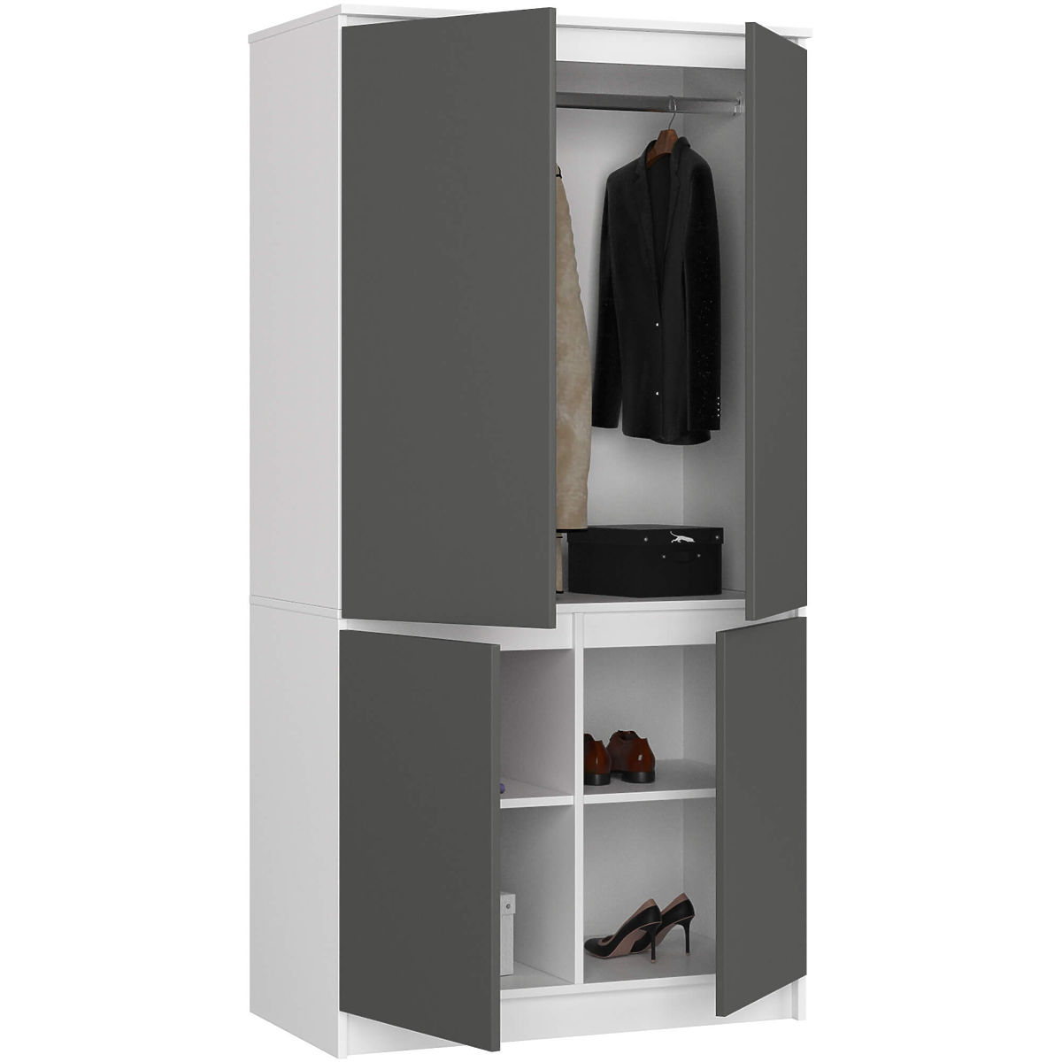 Czterodrzwiowa szafka to uniwersalny i praktyczny mebel, który doskonale uzupełni wyposażenie sypialni, przedpokoju lub salonu w aranżacjach studyjnych. Eleganckie wykonanie i kolorystyka biało-grafitowa szara sprawiają, że szafka idealnie pasuje do klasycznych i nowoczesnych aranżacji. Szafka wyposażona jest w przestronne półki, które są idealne do przechowywania elementów odzieży lub zapasowych pokrowców na kołdry i poduszki, prześcieradeł, obrusów lub koców. W części mebla umieszczonej za uchylnymi drzwiami znajduje się drążek na wieszaki. Półki można wykorzystać na swetry, bluzki, torebki, ale także na przykład na ręczniki. Natomiast drążek sprawdzi się jako miejsce do zawieszania garniturów, sukienek, spódnic i odzieży wierzchniej, takiej jak płaszcze czy kurtki. Mebel charakteryzuje się starannym wykonaniem z najwyższej jakości laminowanej płyty, która jest odporna na ścieranie. Krawędzie szafki zostały wykończone estetycznym obrzeżem ABS.
