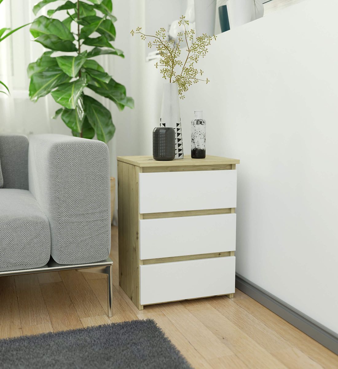 Szafka nocna CL3 40 cm z trzema szufladami w kolorze dąb artisan i białym. .. więcej