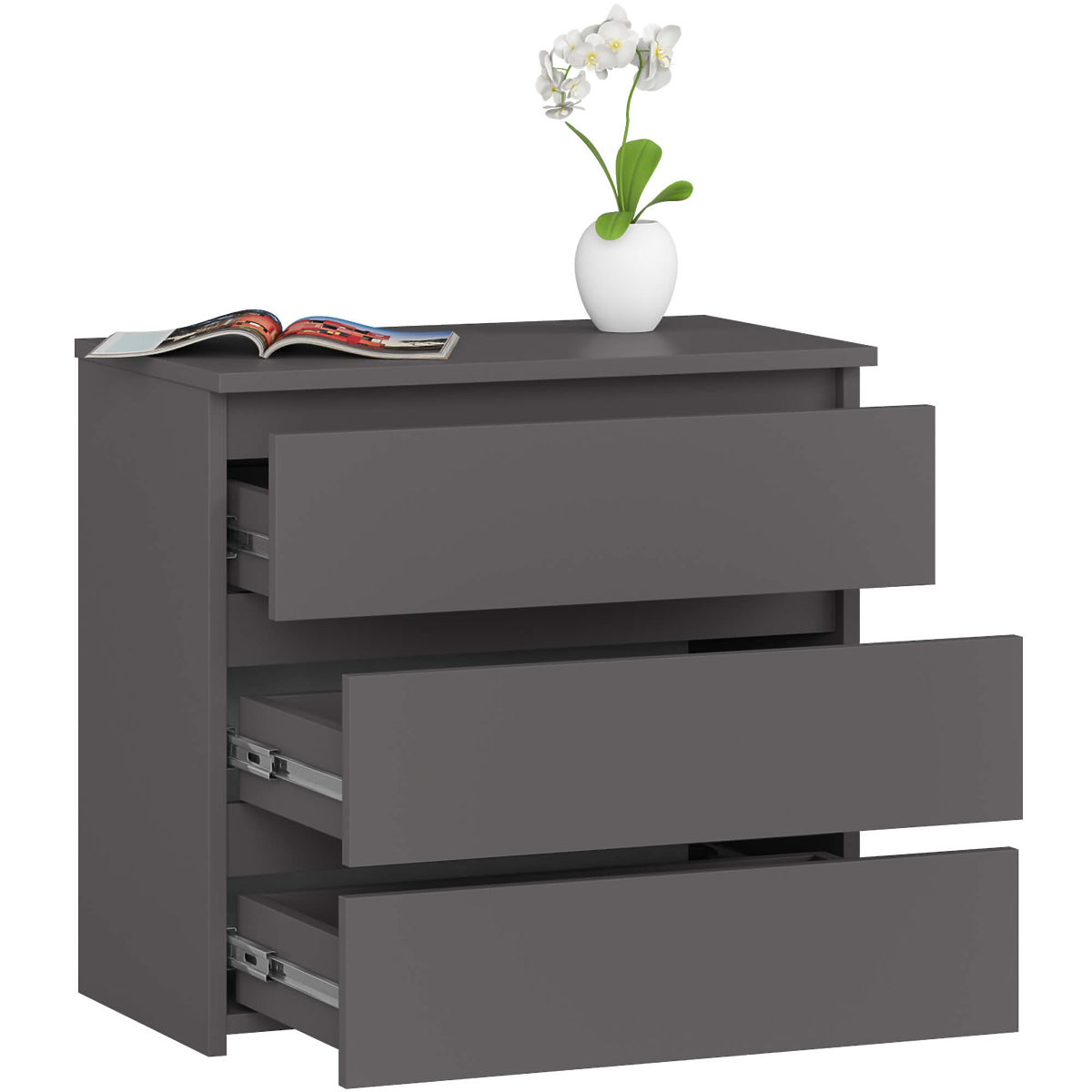 Komoda grafit szary ma 3 wygodnie otwierane szuflady. Doskonale nadaje się do sypialni jako niezbędny element jej wyposażenia. W szufladach można przechowywać bieliznę, akcesoria kosmetyczne lub zestaw pościeli na zmianę. Blat jest idealny do umieszczenia lampki nocnej i położenia ciekawej lektury. Mebel można również umieścić w pokoju dziecięcym i sypialni nastolatka.