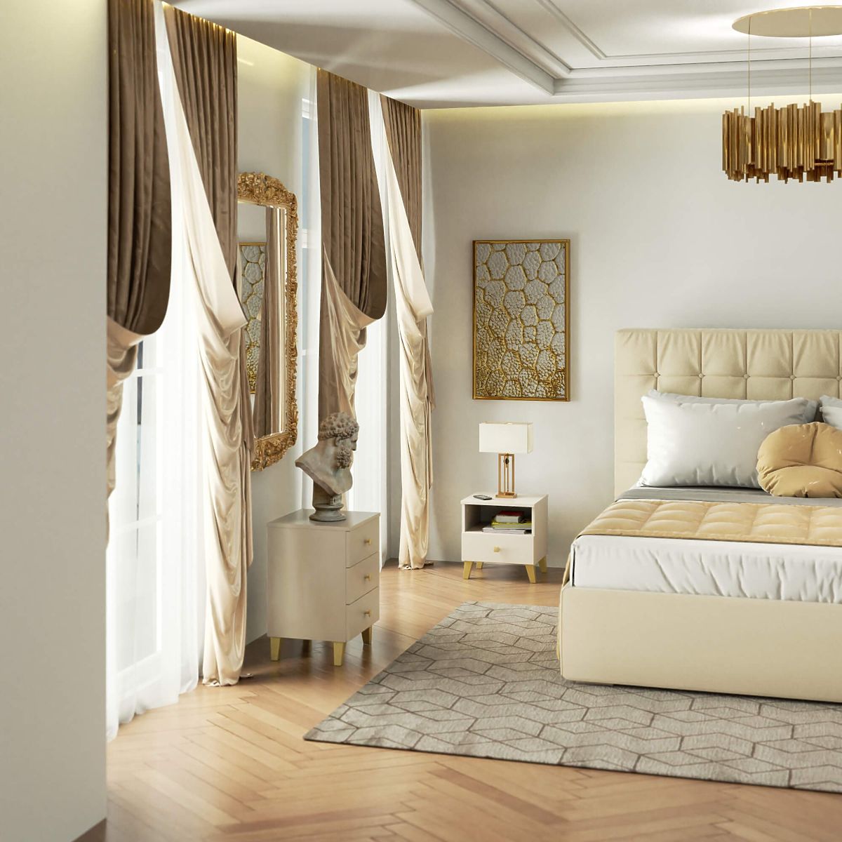 - nowoczesny wygląd - mebel jest prosty w formie, przyciąga uwagę ciekawym połączeniem kolorów kaszmiru ze złotem,